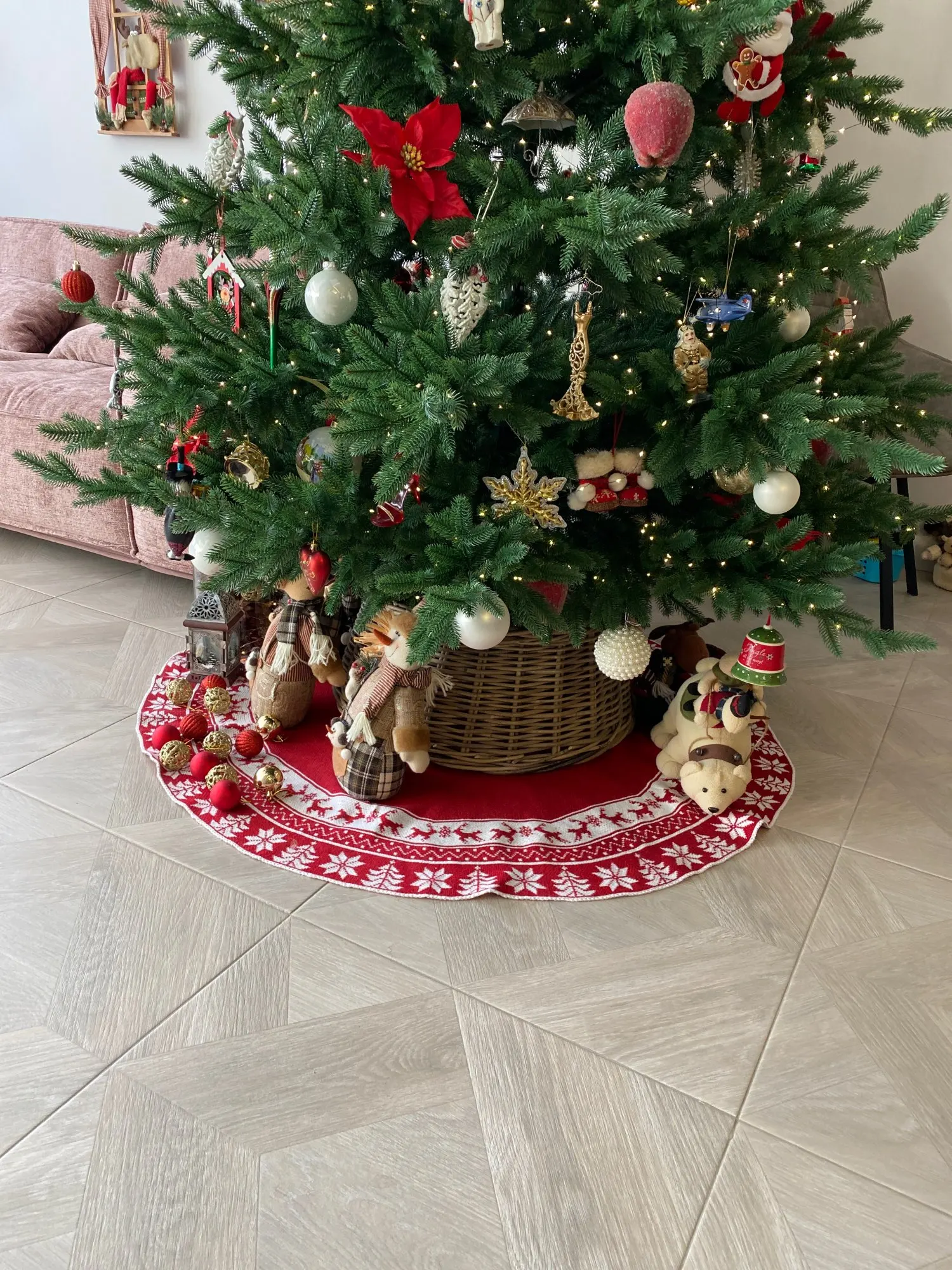 Основание нашей ёлки 60см, корзина надета на основание вплотную. Это вам для представления размеров коврика/накидки