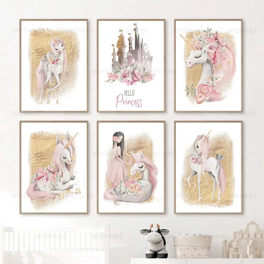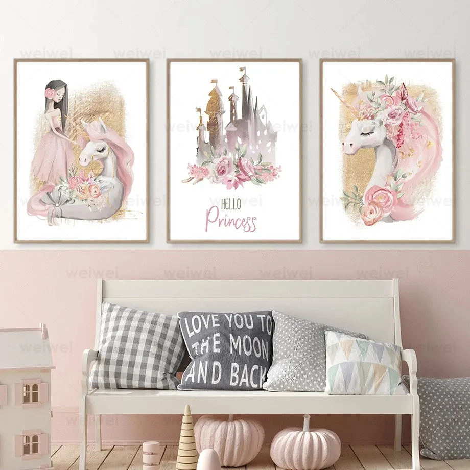 Принцесса Белая лошадь замок розовая роза настенная Картина на холсте скандинавские постеры и принты настенные картины для девочек Декор детской комнаты