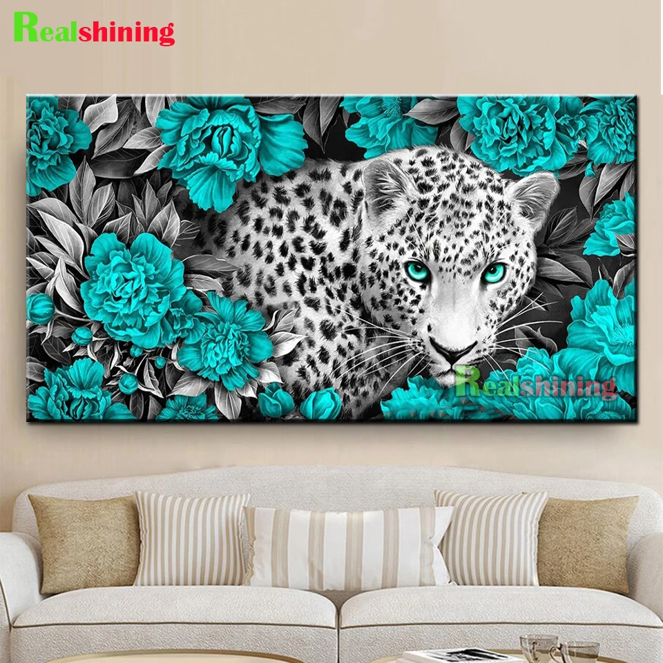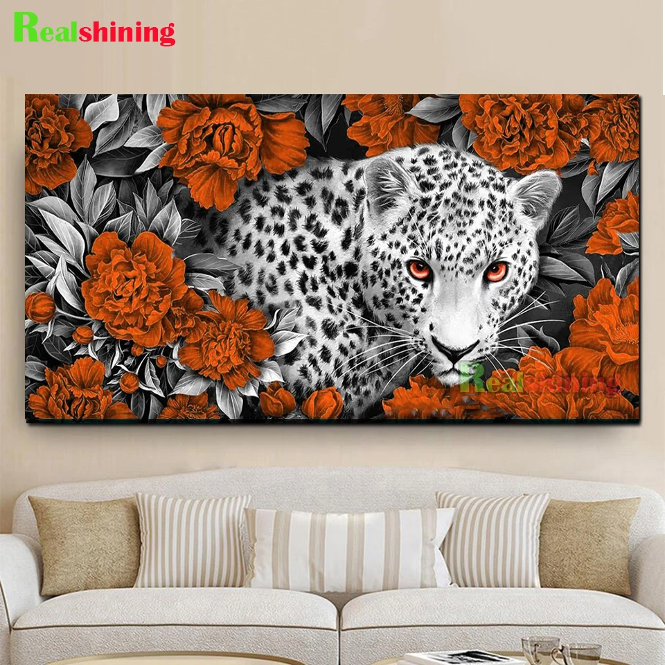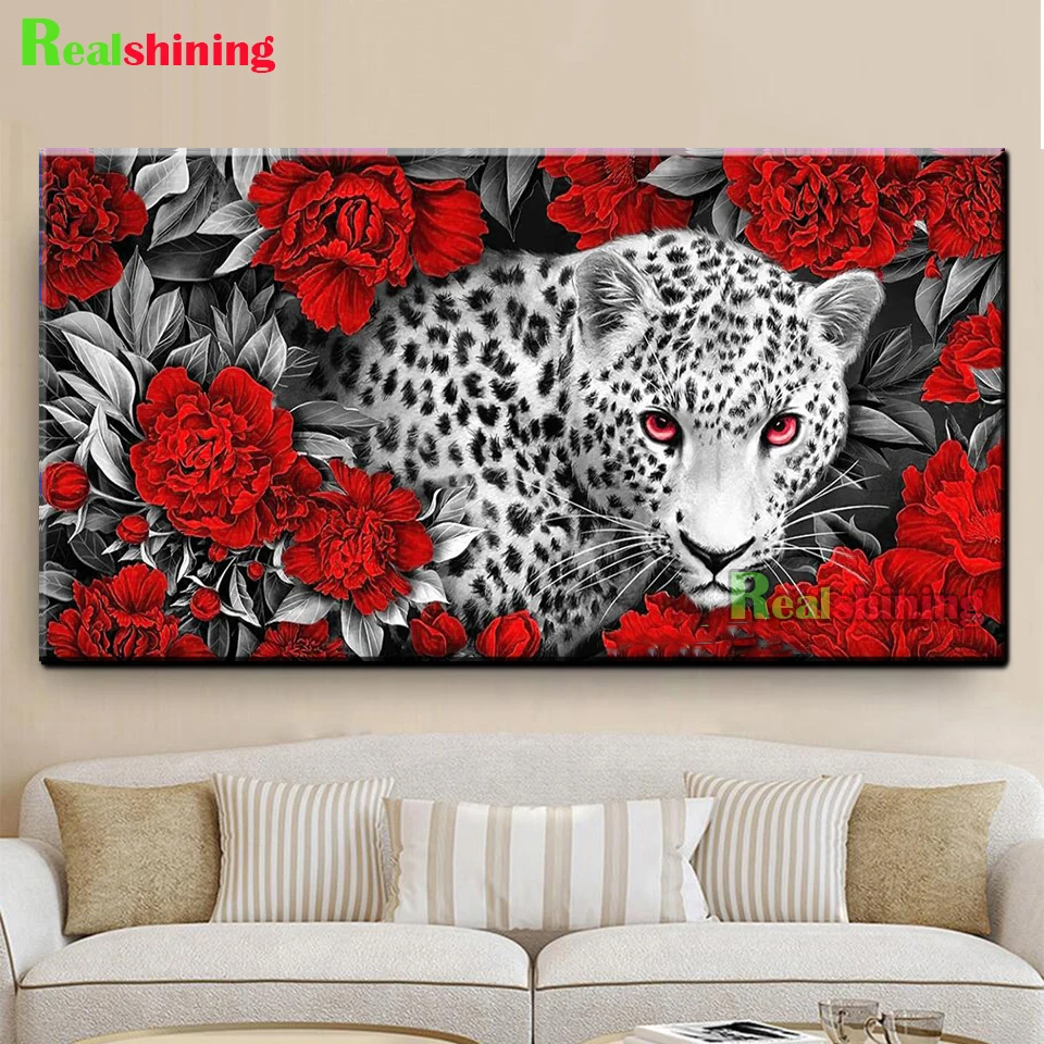 Алмазная 5d картина сделай сам с леопардом дикой природы, большие красные цветные пионы, цветы, алмазная вышивка, полностью Круглая Мозаика, искусство J42