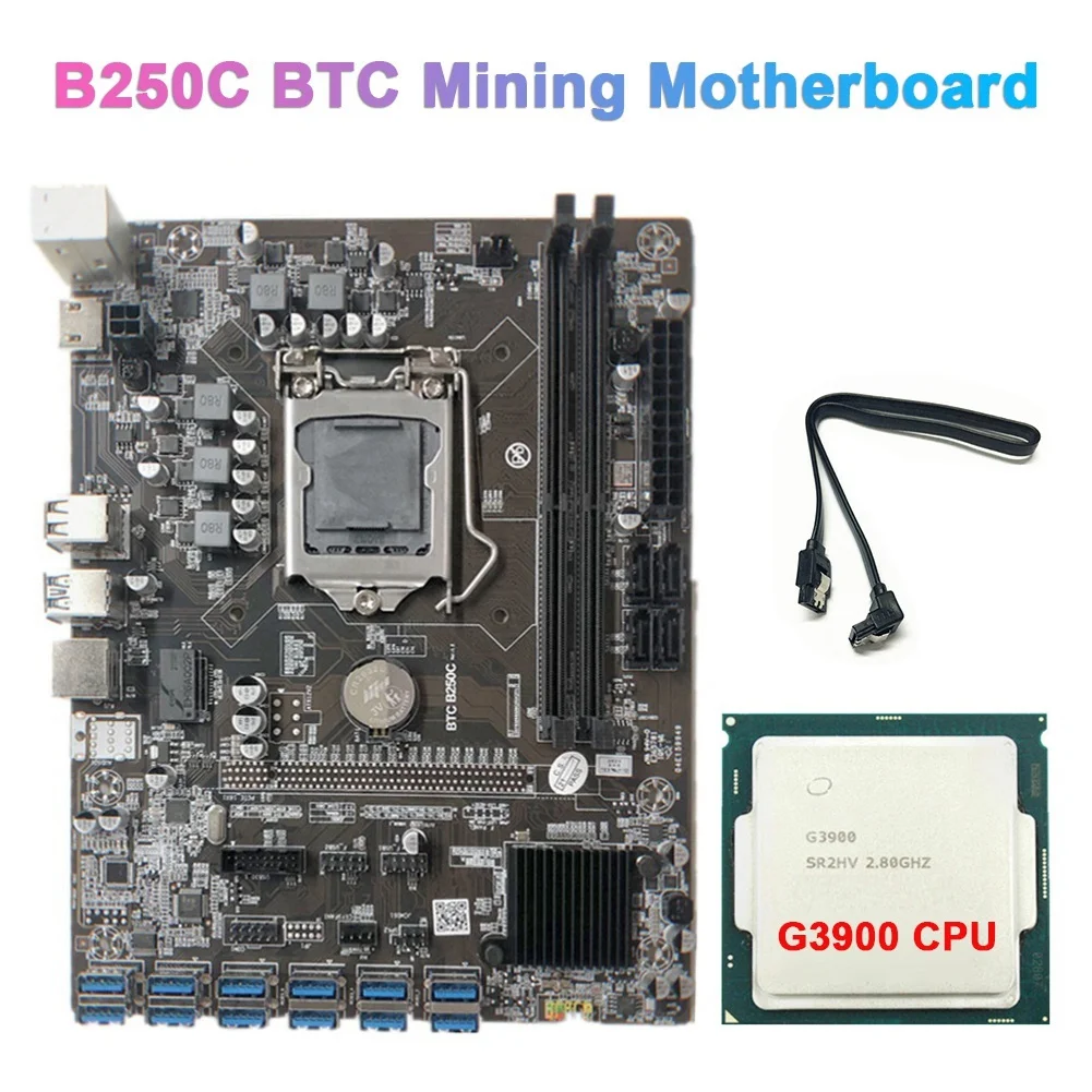 Материнская плата для майнинга BTC B250C с процессором G3900 + кабелем SATA, графический слот 12xpcie к USB 3,0, LGA1151, поддержка DDR4 для игр для майнинга