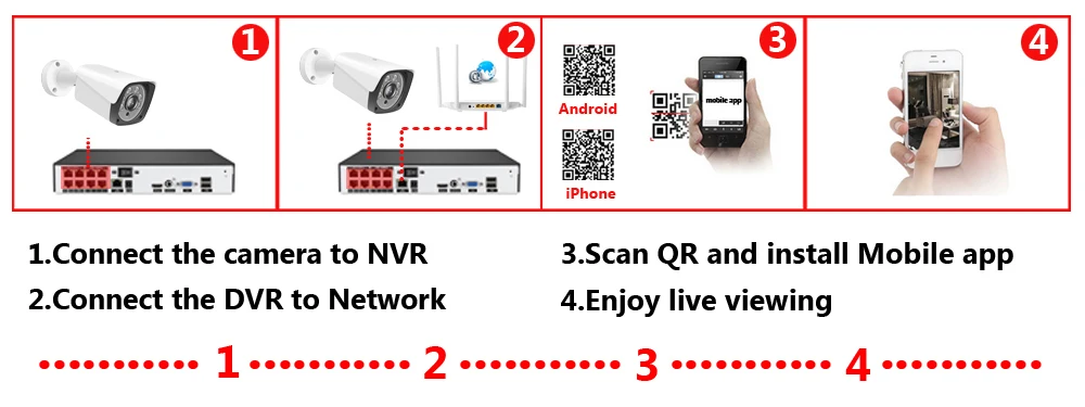 Нет дополнительных кабелей питания или адаптеров, просто подключив ip-камеру к NVR с помощью одного кабеля, вы можете легко завершить установку без знания о компьютере или сети и начать наслаждаться супер простым мониторингом среди вашего смартфона, планшета или ПК.