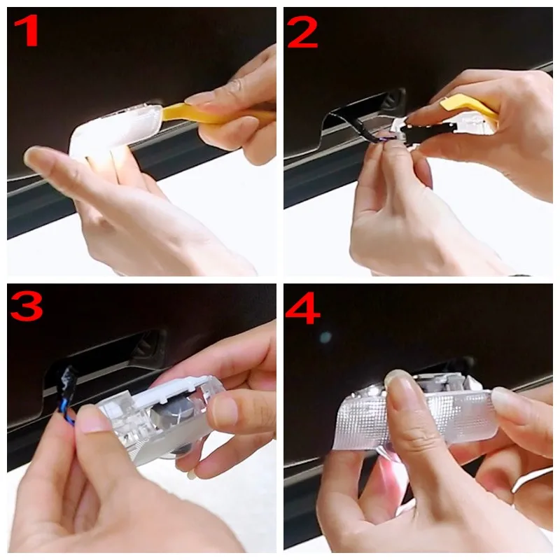Простая установка, непосредственно заменяет оригинальный дверной светильник, нет необходимости сверлить отверстие, легко установить в течение 5 минут, это не повредит оригинальный внешний вид автомобиля.
