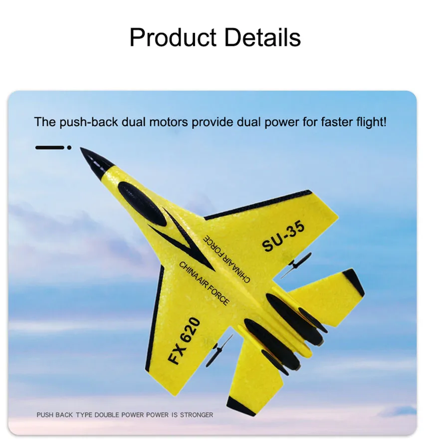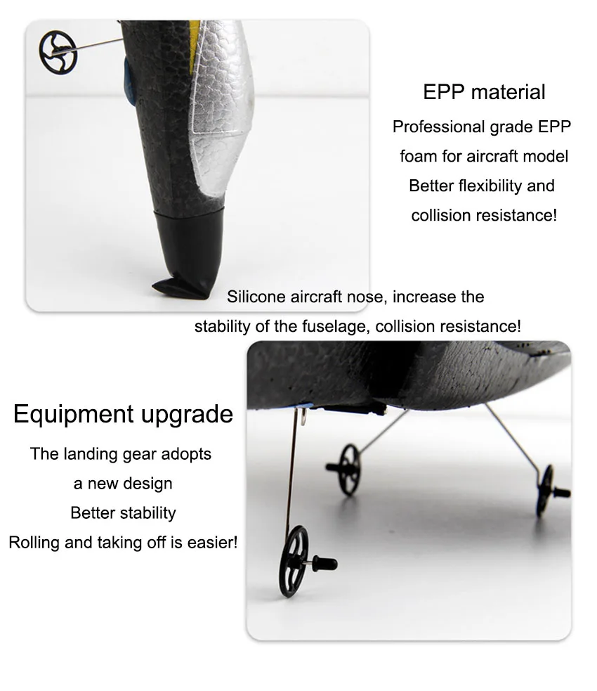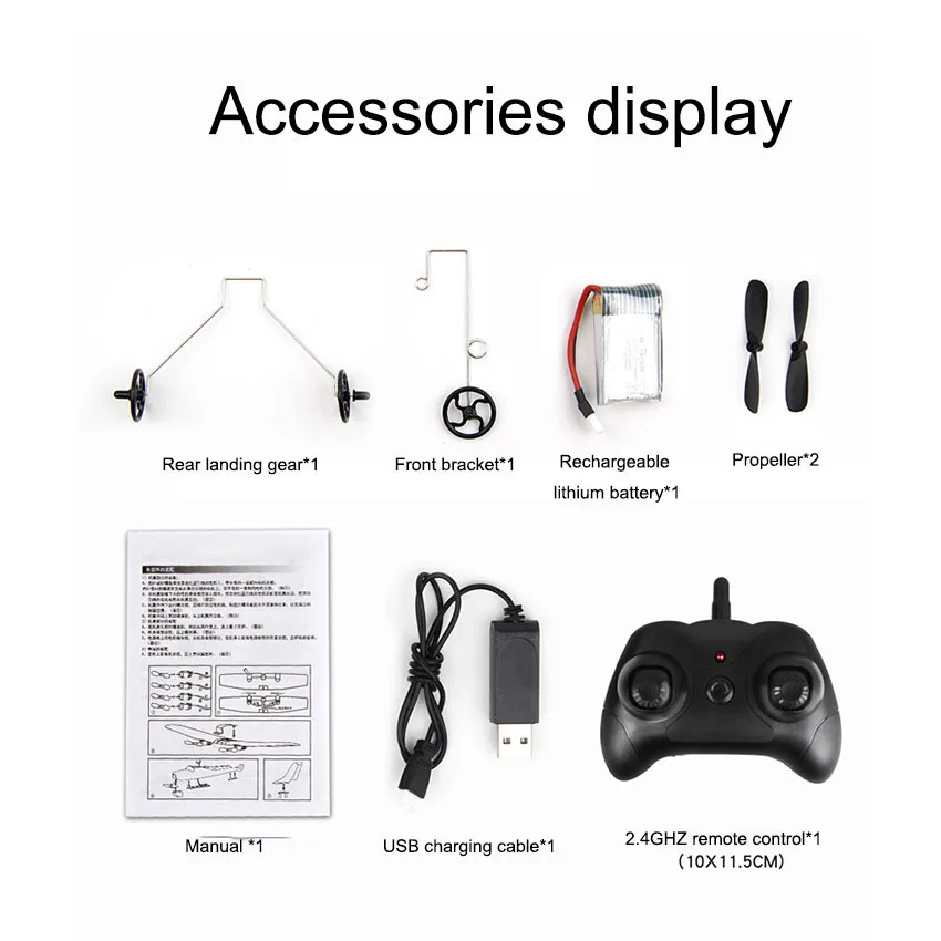 В комплект поставки входит: радиоуправляемый самолет * 1, задняя посадочная шестерня * 1, передняя поддержка * 1, перезаряжаемая литиевая батарея * 1, пропеллер * 2, руководство * 1, usb-кабель для зарядки * 1, 2,4 ГГц дистанционный пульт * 1 (дистанционный пульт потребности ваш собственный подготовить батарейки типа АА * 2!)