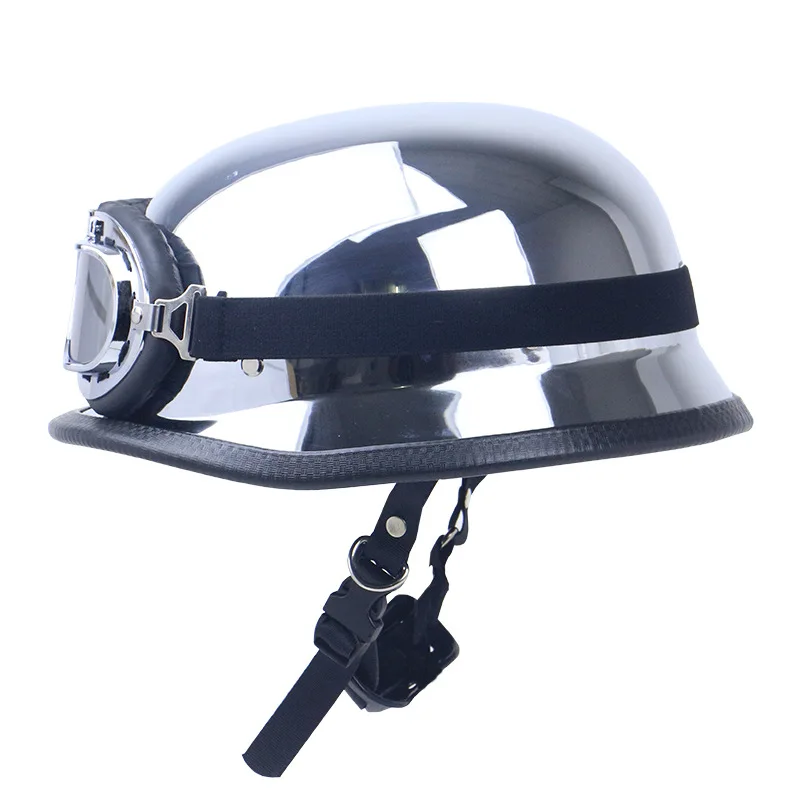 Шлем мотоциклетный в винтажном стиле, хром, серебристый, в немецком стиле, с очками, в стиле ретро