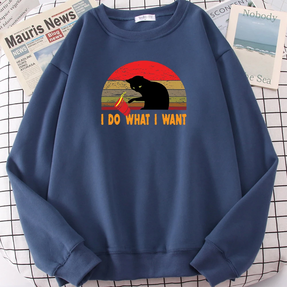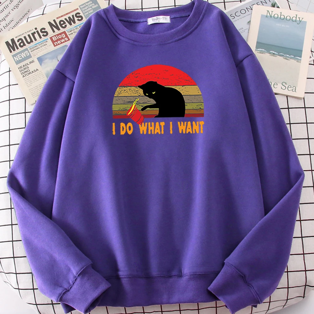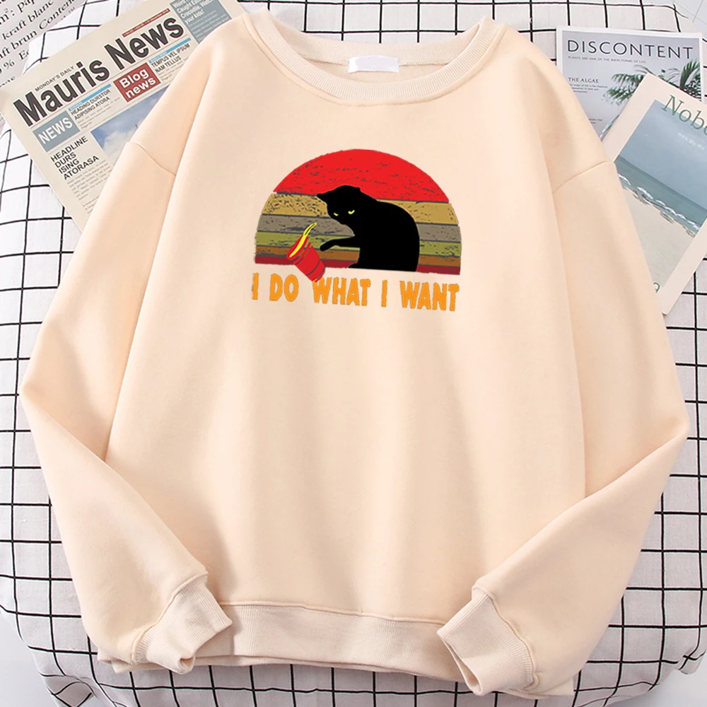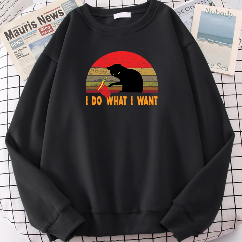 Женская толстовка I Do What I Want, крутые черные толстовки с принтом кота, Женская свободная одежда с забавным графическим принтом, длинным рукавом и круглым вырезом