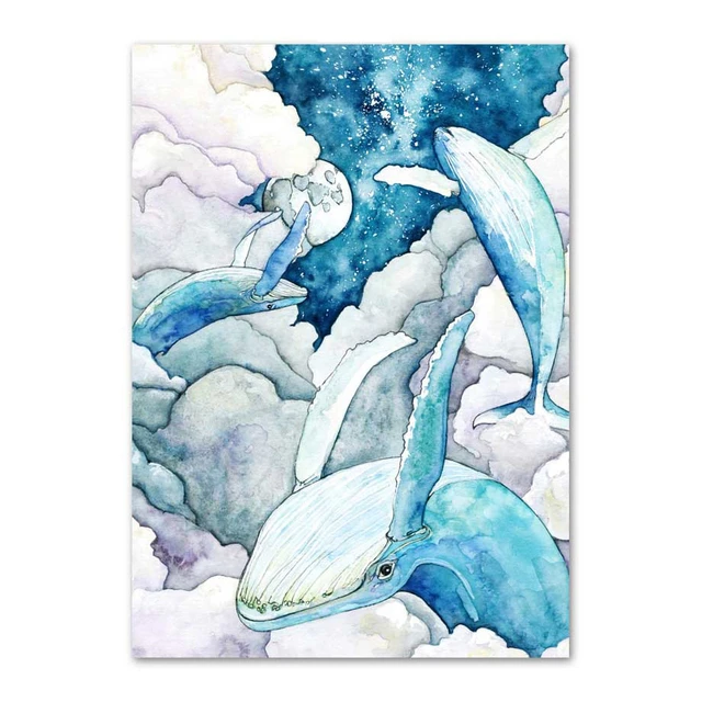 Плакаты с синими акварельными морскими животными, постеры в скандинавском стиле с изображением большого Кита, корабля, Морского Пейзажа, настенные картины для украшения.