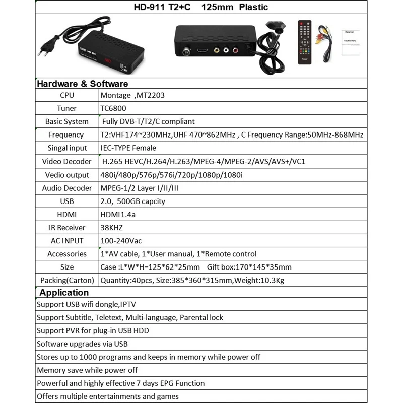 Процессор: Montage MT2203Тюнер: TC6800Система: DVB-T/T2/CСовместимый USB: V2.0HDMI: 1.4AНапряжение: 100-240 ВЧастота: VHF174 ~ 230 МГц, UHF 470 ~ 862 МГцОдиночный Вход: IEC-TYPEЖенский выход Vedio: 480i/480p/576p/576i/720p/1080p/1080iПоддержка: USB WiFi приемник (Ralink RT5370), Megogo, Youtube, IPTV.О декодере:Аудио декодер: MPEG-1/2 уровня I/II/III видео декодер: H.265/H.264/H.263/MPEG-4/MPEG-2/AVS +/VC1-не поддерживает аудио декодер AC3. (H.265 поддерживает фильмы 4K и станет основным в будущем. Особенность AC3-это маленький размер и подходит только для ПК-систем.)Тип штепсельной вилки: штепсельная вилка европейского стандарта, применяется в Индонезии, Германии, Франции, Испании, Италии и т. д.Тип штепсельной вилки: штепсельная вилка США, применяется в Канаде, Индии, Мексике, Таиланде, США, Филиппинах, Тайване и т. д.Цвет: черныйМатериал: пластикРазмер: 125x62x25ммПосылка:Приемник 1 * V1 * av-кабель1 * пульт дистанционного управленияТолько вышеуказанная посылка, другие товары не включены.Примечание: светильник и различные дисплеи могут привести к тому, что цвет товара на картинке немного отличается от реального. Допускается погрешность в измерениях +/- 1-3 см.