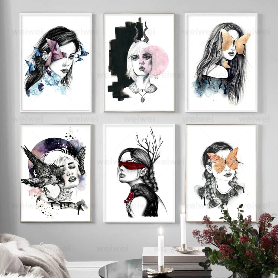 Абстрактная девушка бабочка журавль настенная Картина на холсте скандинавские постеры и принты черные белые настенные картины для декора гостиной