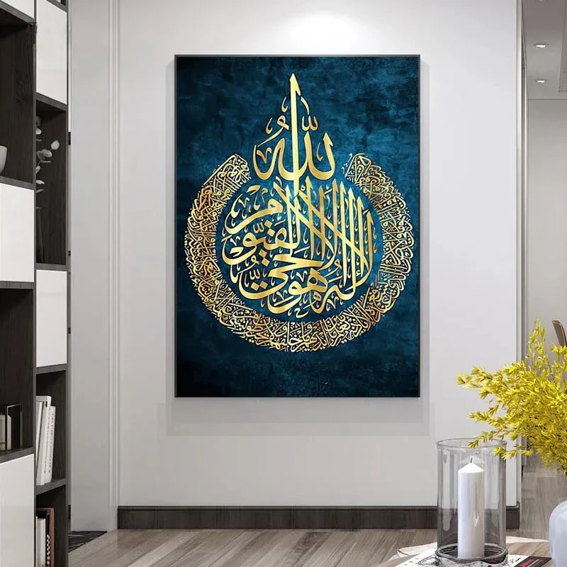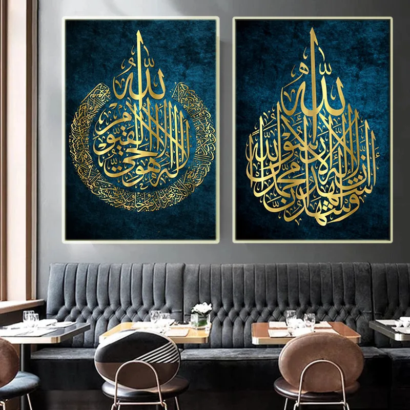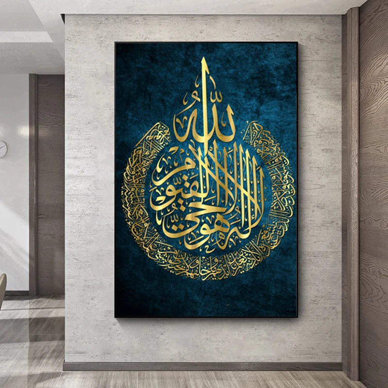 Ayat ul kursi исламский настенный художественный холст Золотая и синяя живопись мусульманская арабская каллиграфия религиозные плакаты и принты украшение