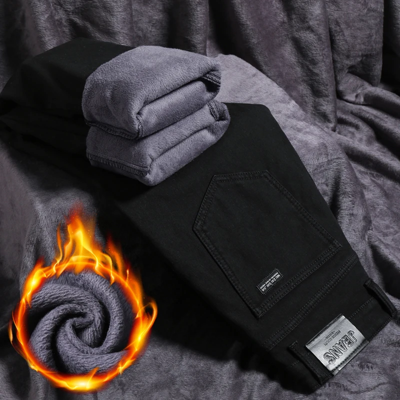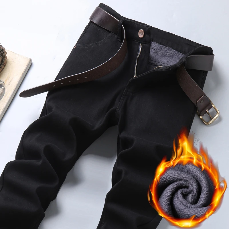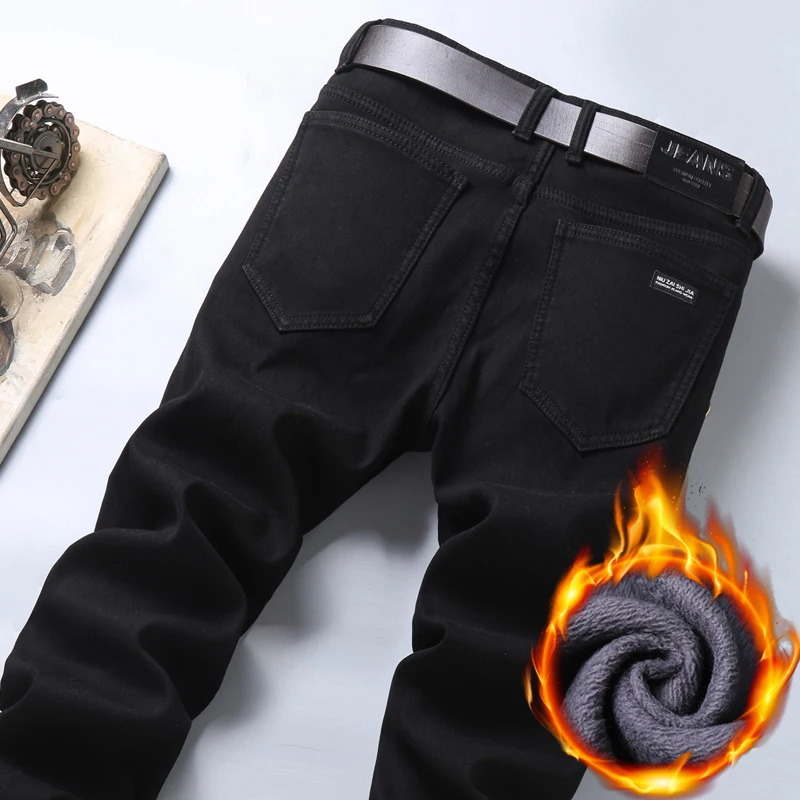 Мужские теплые эластичные джинсы, черные утепленные флисовые брюки на зиму, 2021