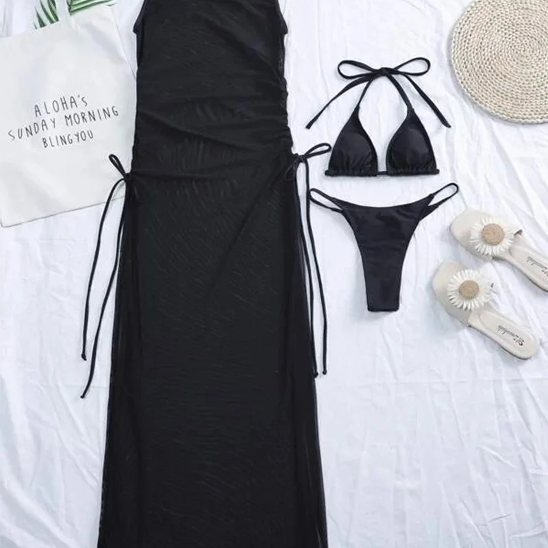Черный комплект из 3 предметов, купальник с высокой горловиной, женский купальник, накидки для женщин, юбки, бикини, халтер, треугольный купальный костюм 2021