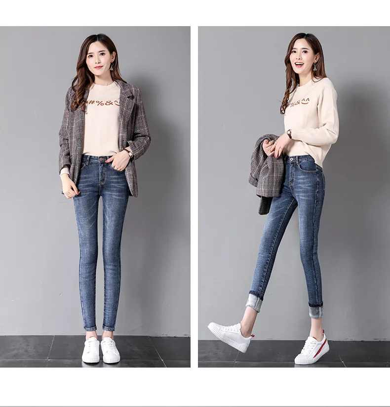 Зимние однотонные сохраняющие тепло повседневные дикие облегающие Стрейчевые брюки с карманами женские джинсы с высокой талией на флисовой подкладке