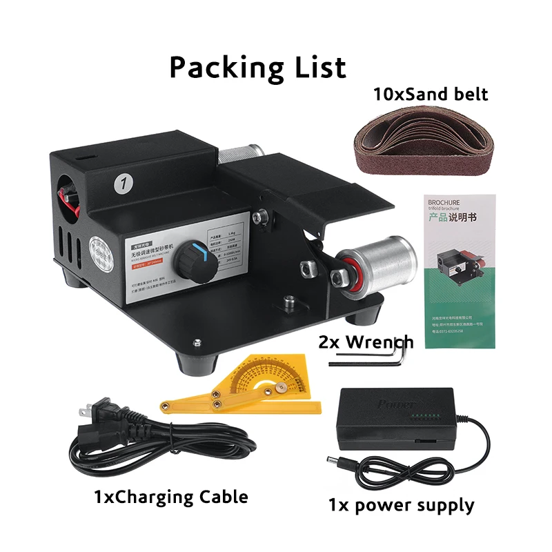 Посылка включает в себя:1 x Электрический ленточный шлифовальный станок2 х гаечный ключ1x источник питания1x зарядный кабель1 линейка10 шт абразивный пояс