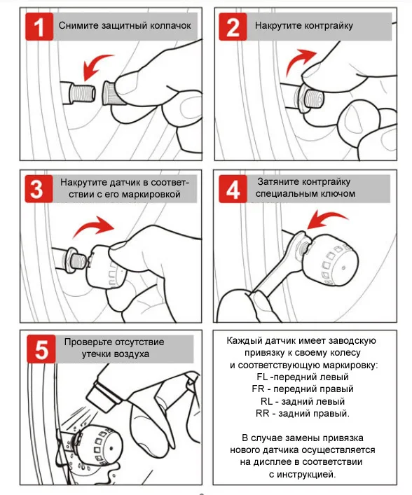 Датчики давления и температуры накручиваются на ниппели вместо обычных колпачков и фиксируются контргайками. В каждом датчике находится батарейка CR1632 (таблетка), её при необходимости можно извлечь и заменить с помощью ключа, который имеется в комплекте. Срок службы батарейки 2-3 года.