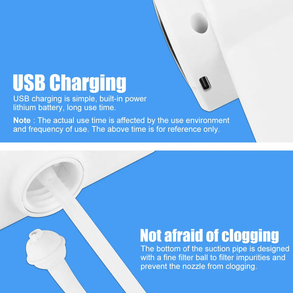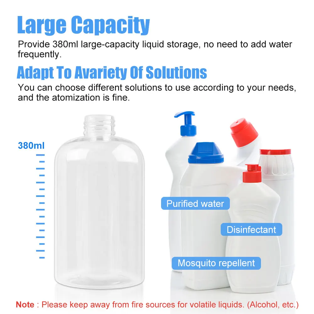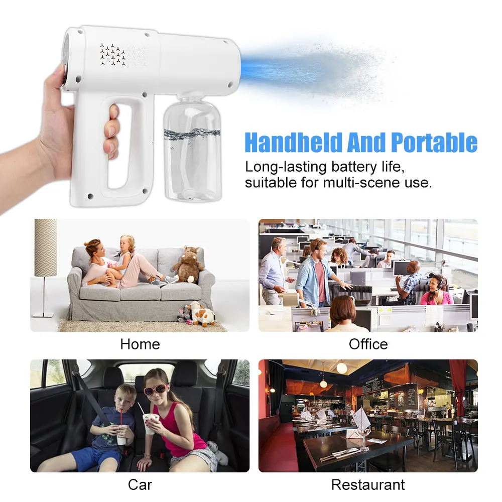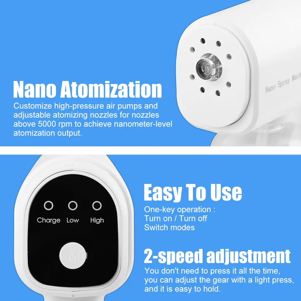 Распылитель, стерилизация при комнатной температуре, очень тонкий Водный туман, без остатка Использование двухъядерного процессора, независимая технология подзарядки, мощная производительность, долговечная стабильность Выход для достижения уровня распыления, изготовленные на заказ воздушные насосы высокого давления и сопла сифона для распыления свыше 5000 об/мин На расстояние распыления может быть до 1,5 метров, и это может быть распылять непосредственно на поверхности человеческого тела, ткани, бытовой техники и других объектов без чувство мокрой. Равномерно закрывает без мертвых углов, легко чистится и тщательно В дополнение к повседневной санитарно-гигиенической и дезинфекции, он также может заменить внутренние увлажнители, ароматерапевтические машины, пополняющие воду, устройства для полива и т. д.