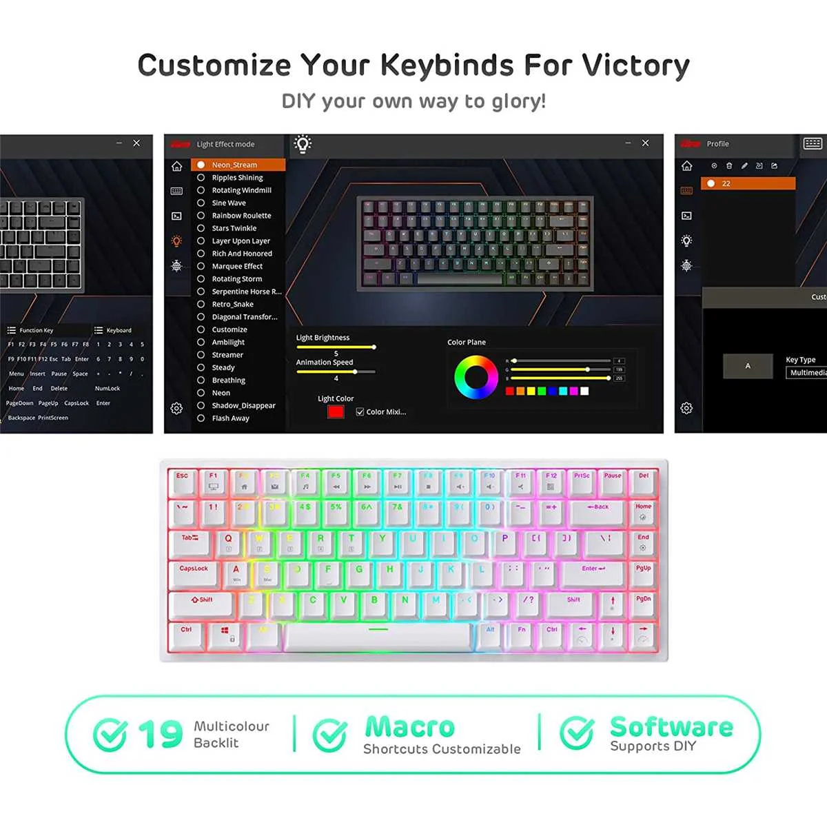 ● Три режима: Беспроводной bluetooth5.0, 2,4 ГГц и USB-C проводной, без каких-либо ограничений по поводу вашего соединение клавиатуры● 3 устройства можно хранить и переключать в режиме BT. Свободно переключайтесь на любое устройство с поддержкой bluetooth● Компоновка 84 клавиш: Инновационная уникальная компоновка 80% отличается от традиционной клавиатуры TKL, которая отрезает больше места, поддерживая те же функциональные возможности, что и практичные стрелки, мультимедиа и кнопки управления.● Переключатель RK с возможностью горячей замены: печатная плата с возможностью горячей замены позволяет свободно заменять 3 контакта/5 контактов без проблем с пайкой. Получайте удовольствие от создания собственной уникальной клавиатуры.● Встроенная перезаряжаемая батарея емкостью 3750 мА · ч: недельный срок службы до 200 часов без остановок при выключенном состоянии подсветки, для полной зарядки требуется всего 6-7 часов.● Различные режимы подсветки RGB: 19 встроенных режимов подсветки RGB выбираются для различных потребностей игры. 5 уровней яркости и скорости потока, регулируемые для любых случаев. Загорается и наслаждайтесь собственным RGB vibe.