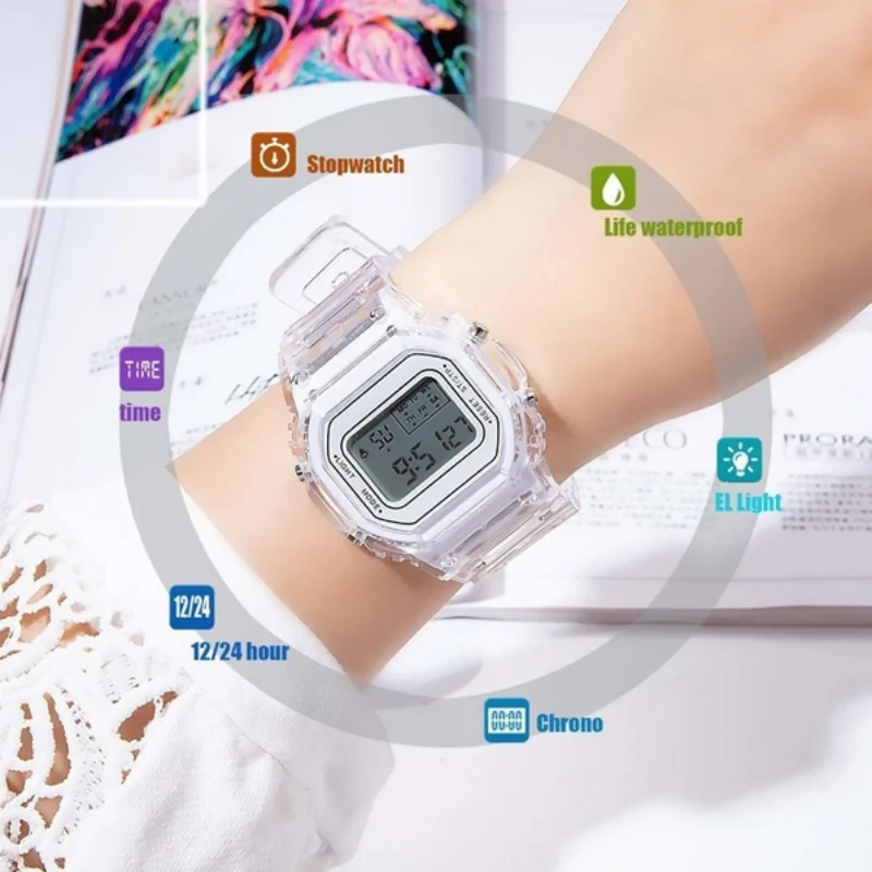 Часы наручные женские цифровые прозрачные, модные светящиеся водонепроницаемые спортивные светодиодные с хронографом и будильником для молодых студентов