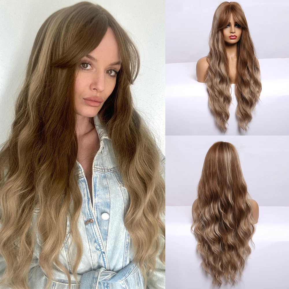 Длинные Синтетические волнистые парики с челкой, Омбре, коричневый ...