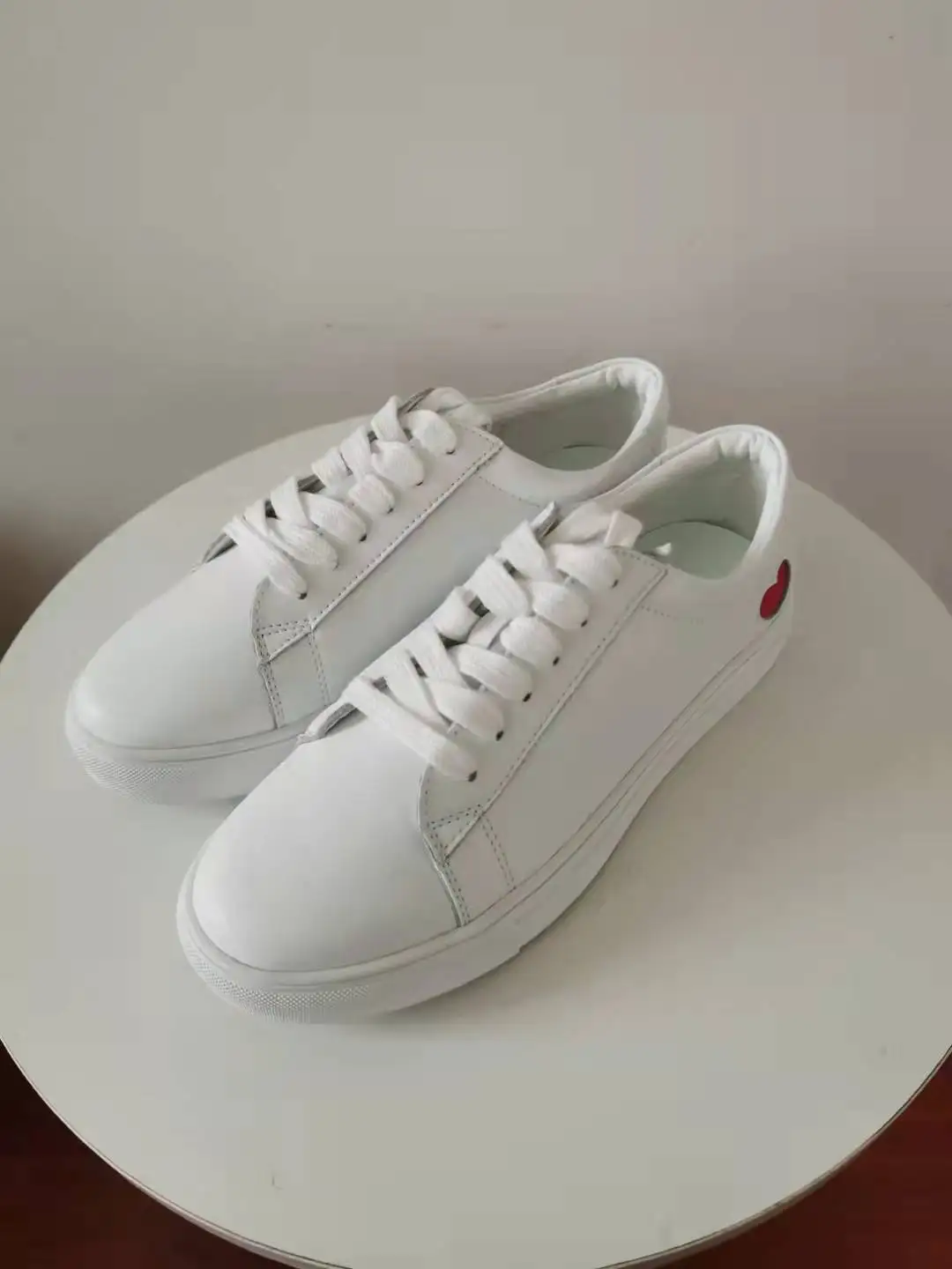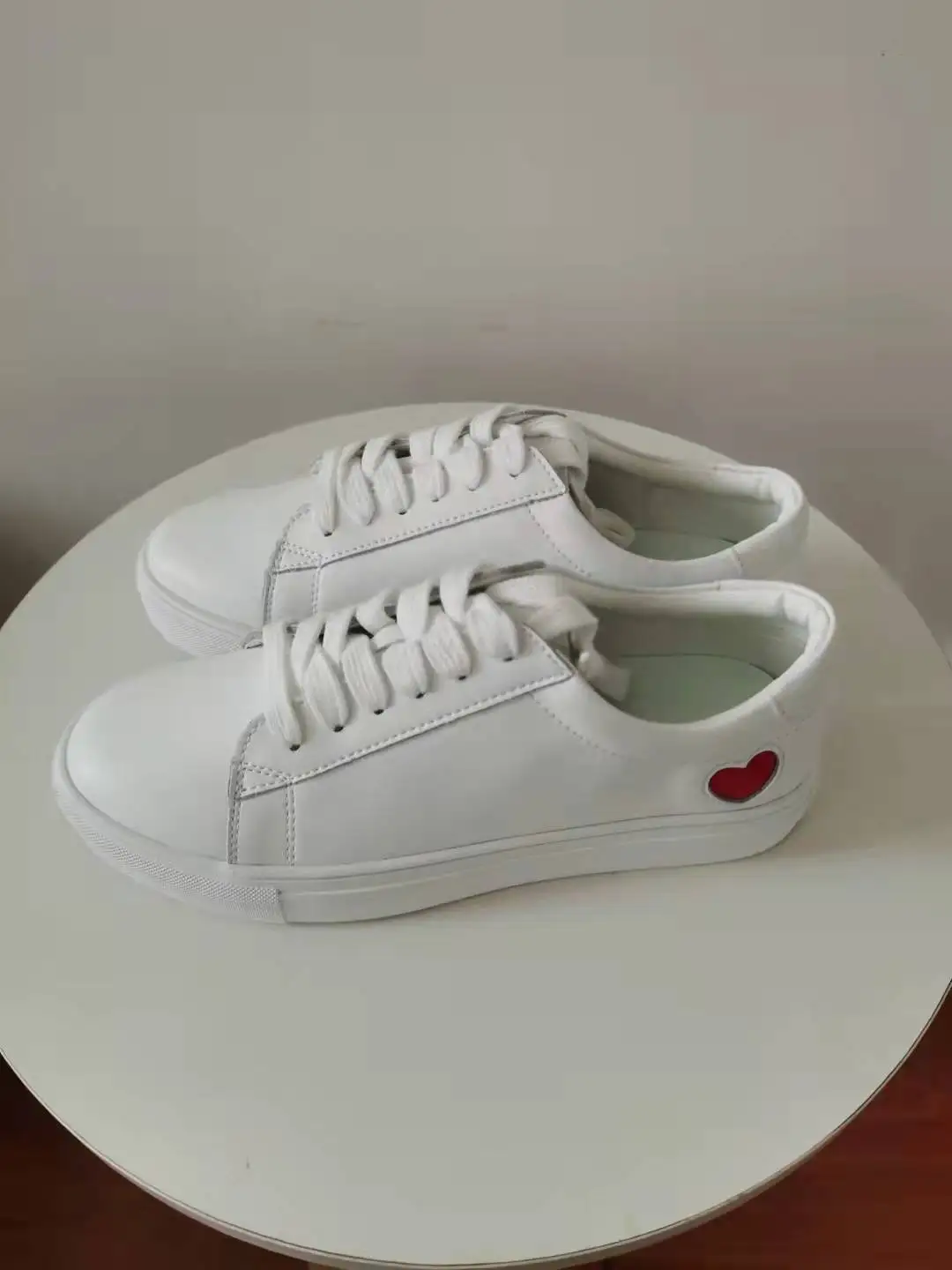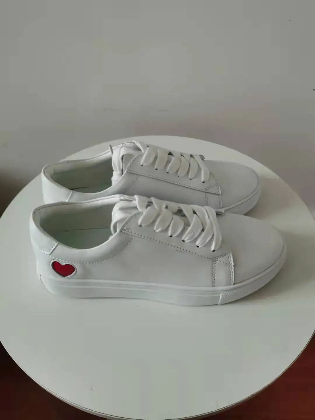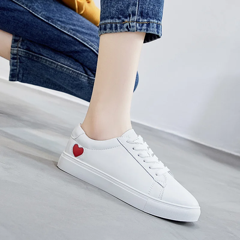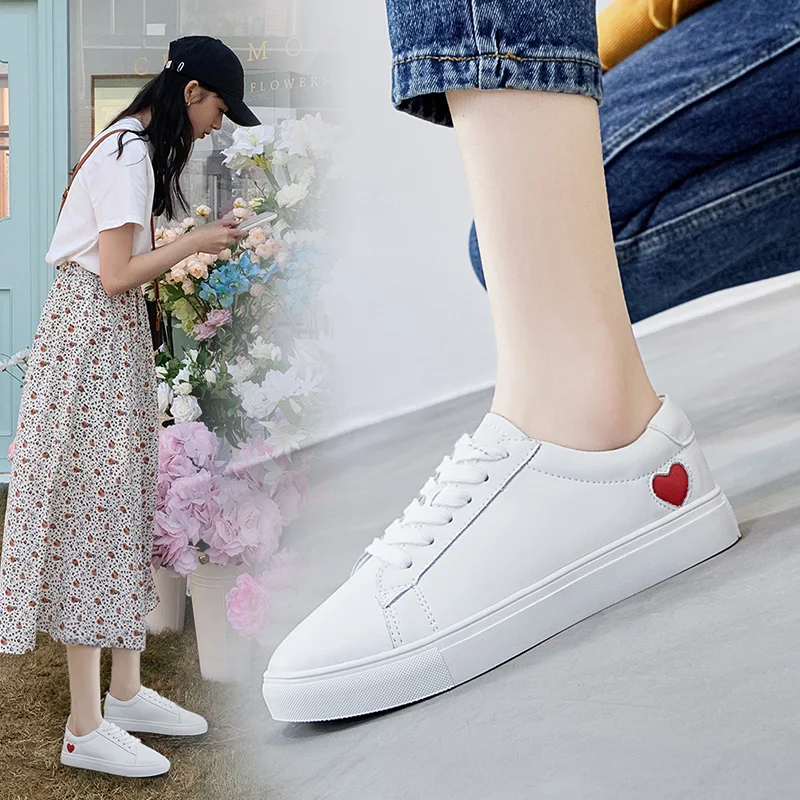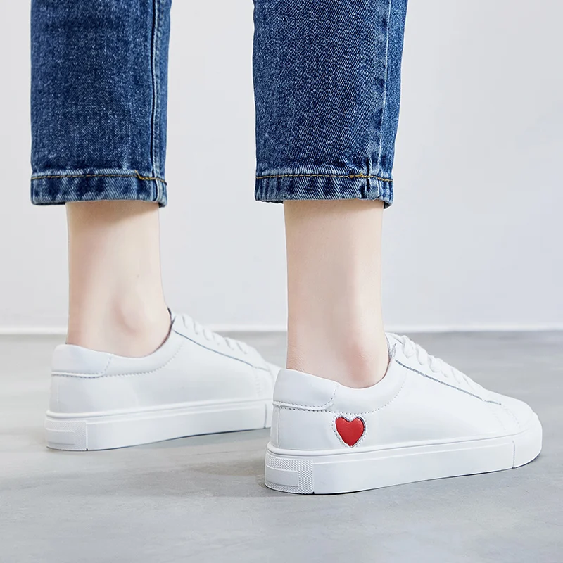 Женская обувь из искусственной кожи, Повседневная дышащая обувь на плоской подошве с милым сердечком, белые кроссовки, осень 2019