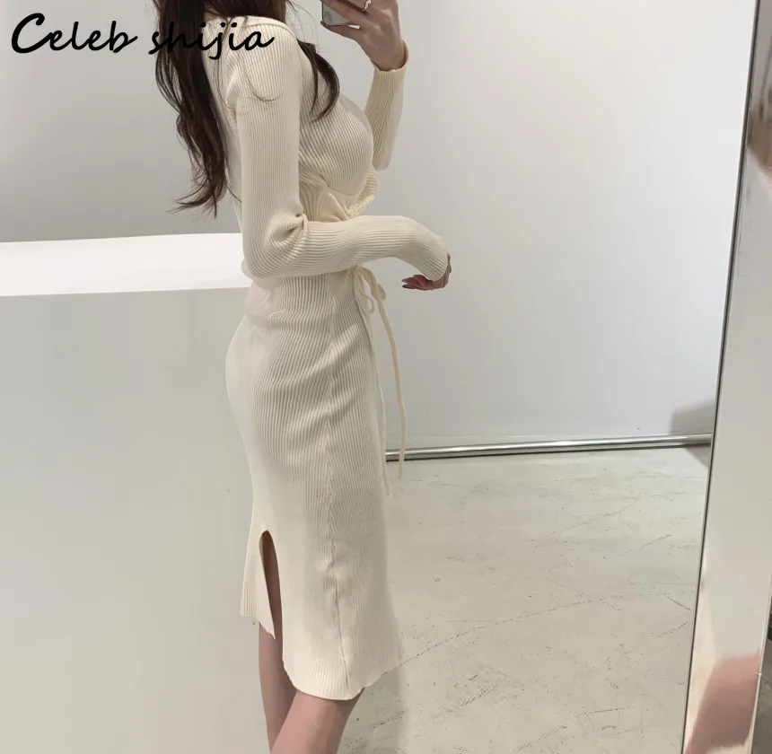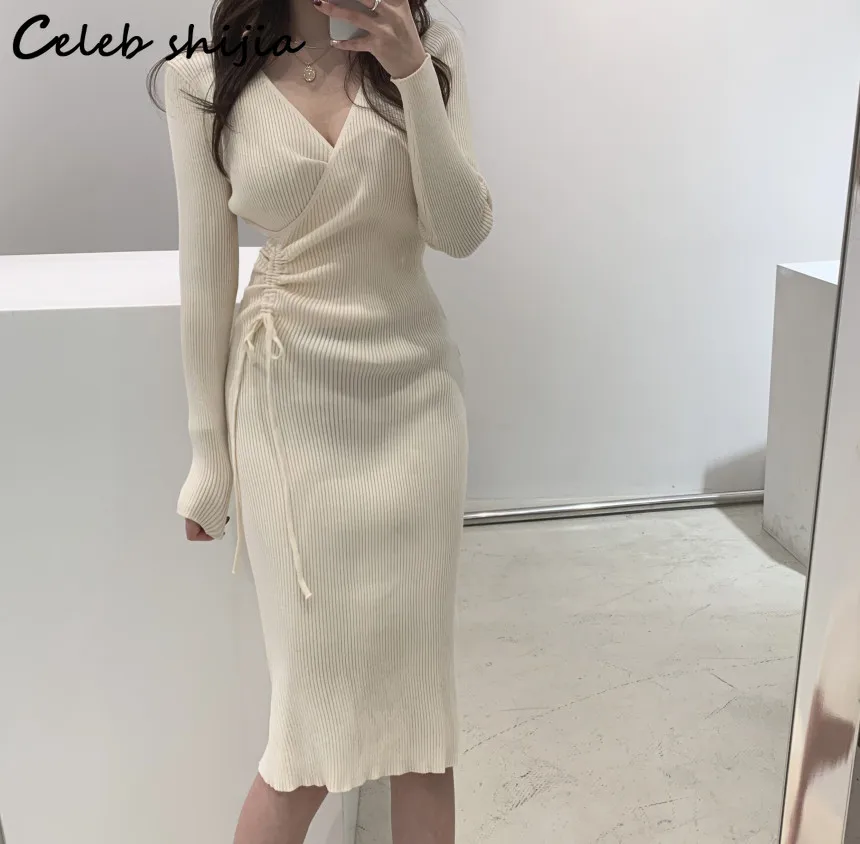Осеннее вязаное платье SHIJIA абрикосового цвета, женское элегантно...