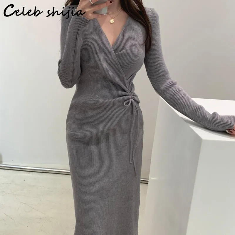 Женское трикотажное платье, с V-образным вырезом и длинными рукавами