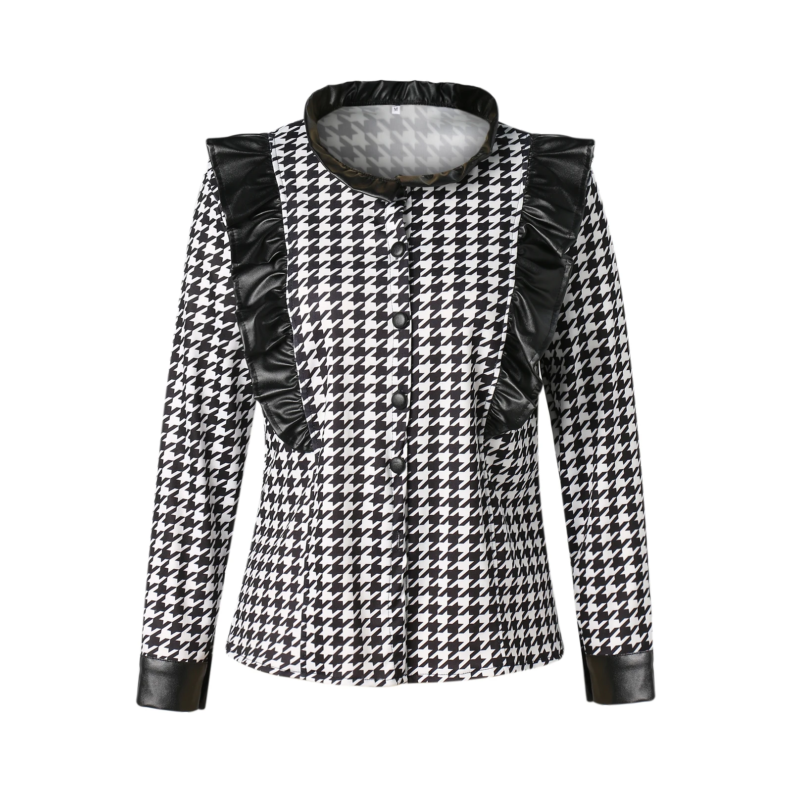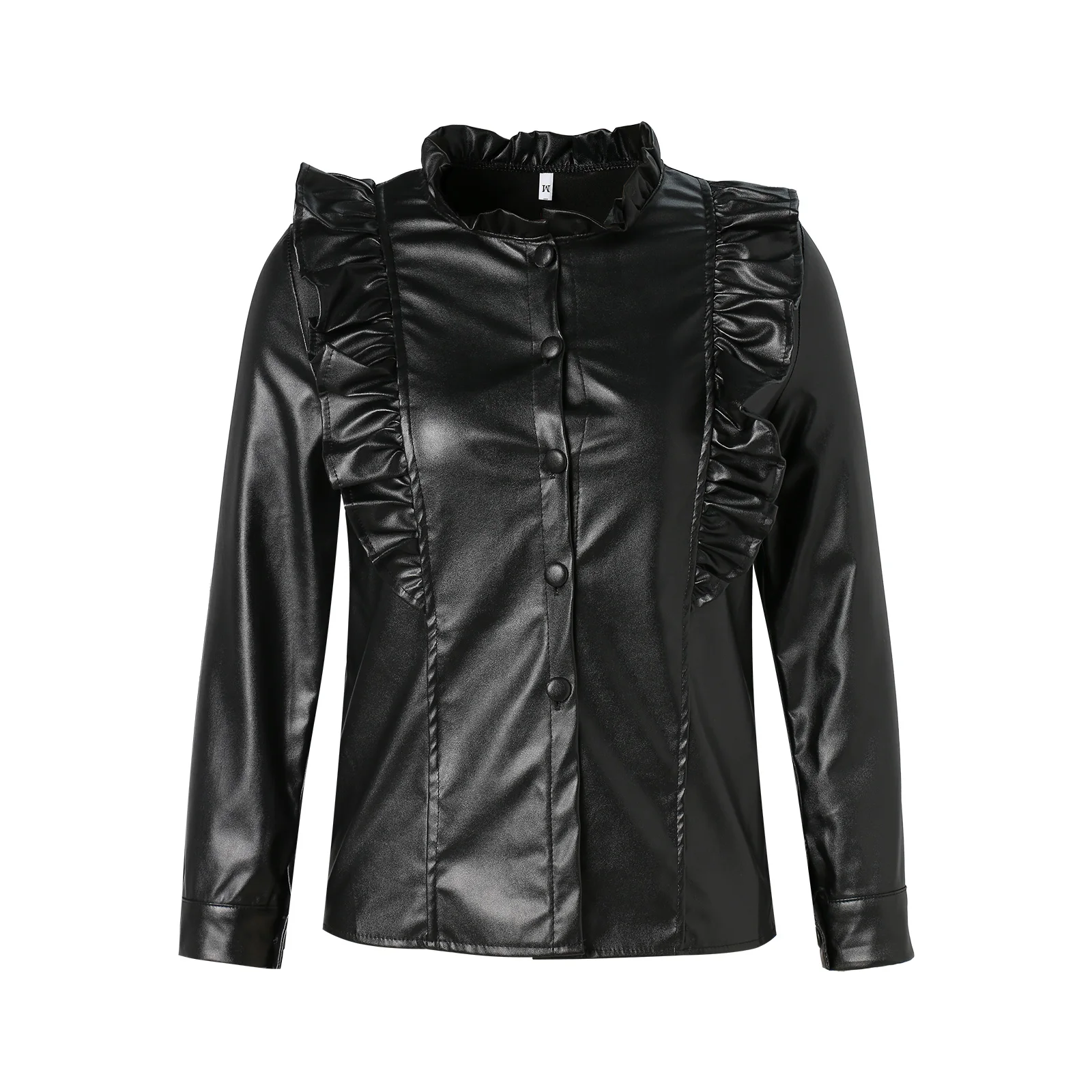 Женская модная рубашка с высоким воротником и оборками, топы из искусственной кожи с длинным рукавом и завышенной талией
