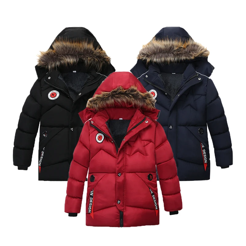 Зимняя утепленная длинная куртка для мальчиков с меховым воротником и капюшоном, плюшевая подкладка, плотная модная верхняя одежда для детей, детская ветрозащитная куртка