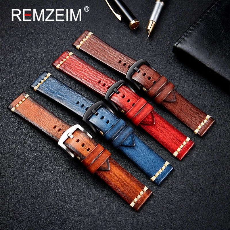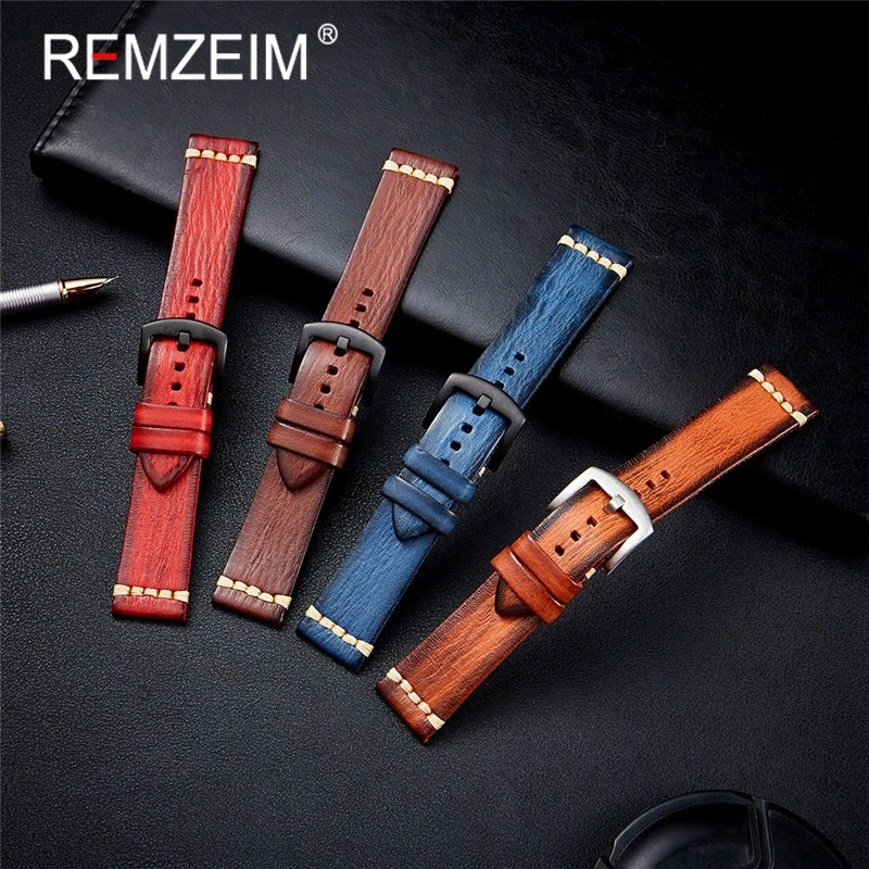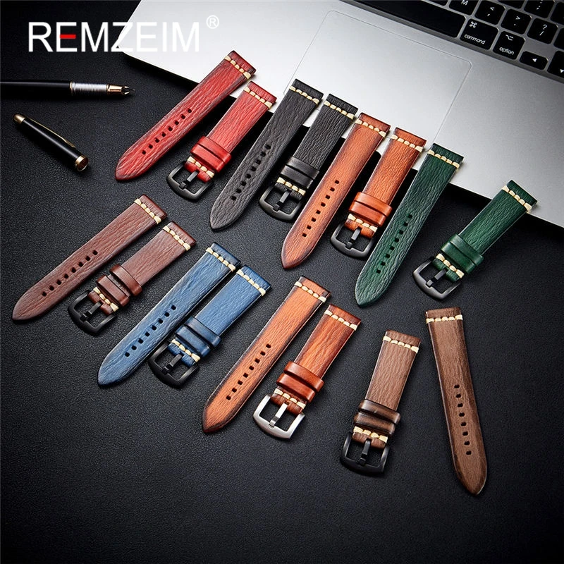 Ремешок для часов REMZEIM из натуральной кожи в стиле ретро, браслет для Galaxy Watch 18 мм 20 мм 22 мм 24 мм, черный красный зеленый браслет для наручных часов