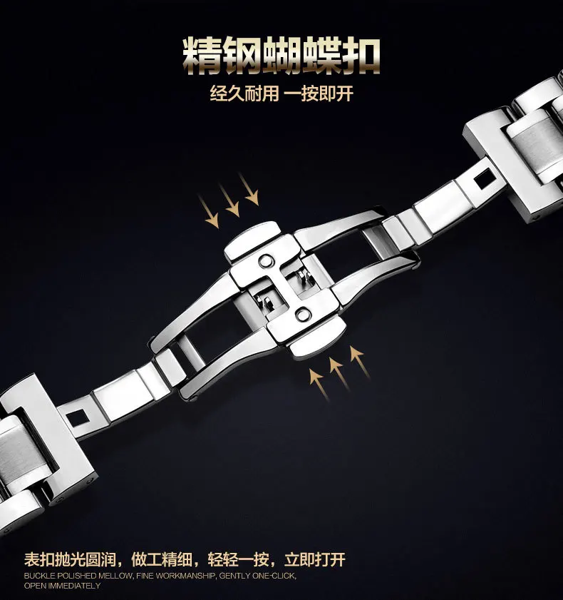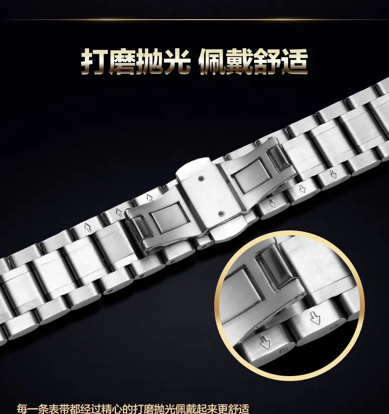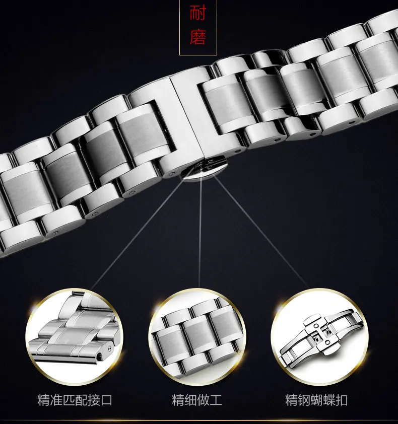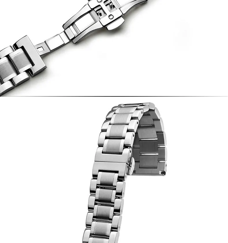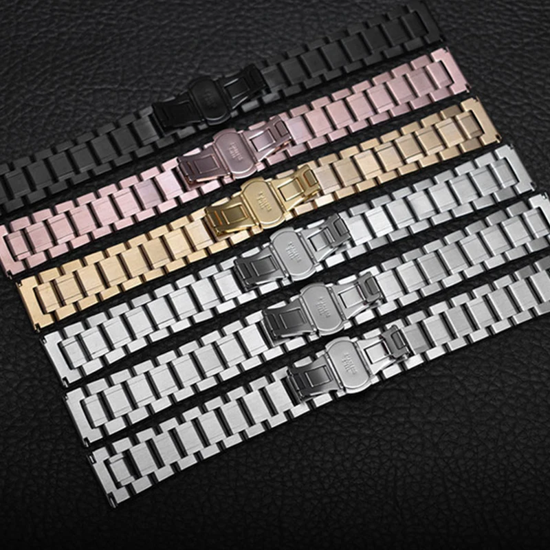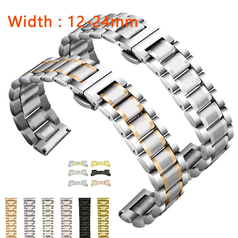 -100% Новое и высокое качество-Браслет из нержавеющей стали-Размер: 12 мм, 14 мм, 16 мм, 17 мм, 18 мм, 19 мм, 20 мм, 21 мм, 22 мм, 23 мм, 24 мм-Пряжка-бабочка из нержавеющей стали с двойным нажатием-Цвет: серебристый, черный, золотой, розовое золото, Серебряное золото, Серебряное розовое золото-Интерфейс: плоский интерфейс + изогнутый конец, подходит для большинства наручных часов-Комплектация: 1 * ремешок для часов + 3 булавки + 1 инструмент