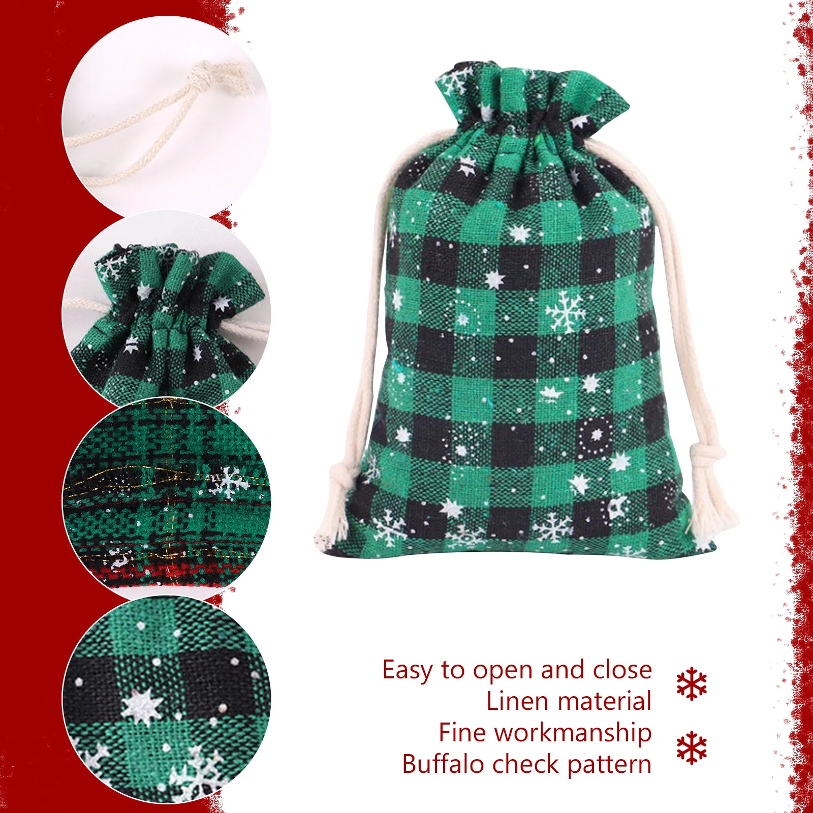 Рождественская клетчатая сумка-Льняная сумка на шнурке, рождественские пакеты, многоразовые рождественские подарочные пакеты с картами, упаковка ювелирных мешков DIY ремесло, мини-сумка для хранения свадебных сувениров, вечерние, DIY ремесло и РождествоХарактеристика:Эти рождественские клетчатые конфетные сумки из буйвола изготовлены из мягкого льна, который является мягким и удобным и имеет тонкое мастерство.Нелегко сломать или выцветать, давая вам хороший опыт и служить вам в течение длительного времени.Плед Буффало: эта мягкая Льняная сумка с классическим узором в клетку Буффало, которая полна рождественского вкуса и подарит вам незабываемые праздники.Хранение мелких предметов: эти праздничные вечерние подарочные пакеты имеют достаточную емкость для хранения различных небольших подарков, таких как конфеты, печенье, шоколад, игрушки, ювелирные изделия, фотографии и т. д. Которые безопасны и упорядочены, что позволяет вам делать вечерние подарки.Легко открывать и закрывать: Эти рождественские мешки разработаны с кулиской, что обеспечивает удобный способ закрытия и открытия. Просто положите подарок в сумку и затяните шнурок, чтобы затянуть его, что также может защитить ваши вещи от падения.Спецификация:Размер: 14*10 см/5,51*3,93 дюймаМатериал: ленСтиль: зеленая клетка/Красная клетка/зеленая полоса/красная полосаПримечание:В связи с различиями мониторов и эффектами освещения реальный цвет товара может немного отличаться от цвета на фотографиях. Спасибо!Возможны отклонения в 1-2 см вследствие измерений вручную.