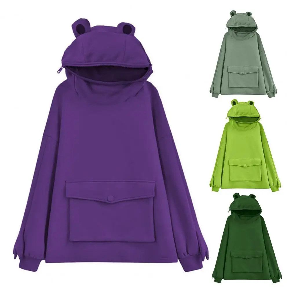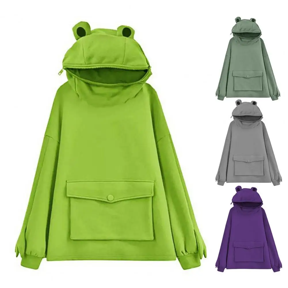 Пуловер в форме лягушки, толстовка с большими карманами, Осень-зима, Женский свитшот с капюшоном, верхняя одежда, винтажная уличная одежда оверсайз