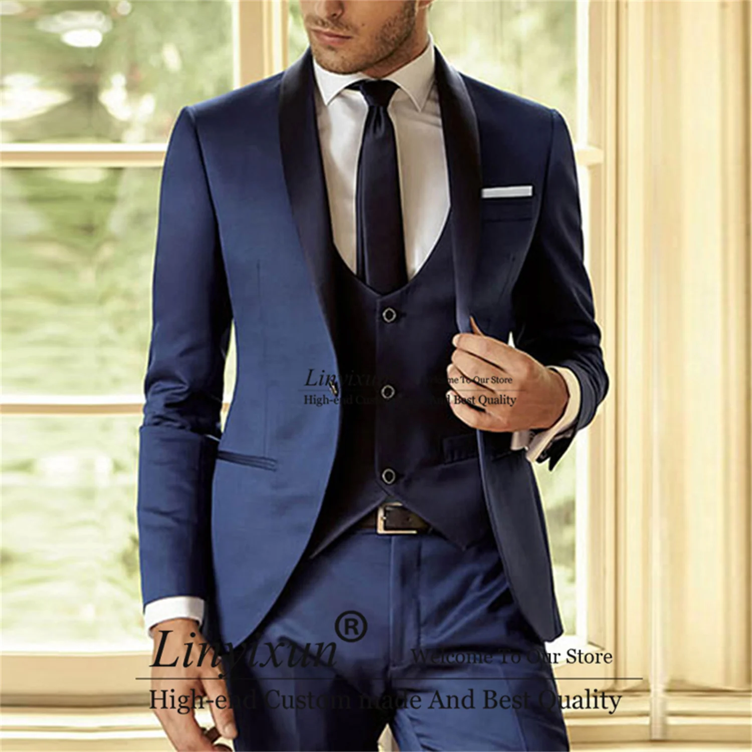 Смокинг для жениха темно-синий для свадьбы, приталенный мужской костюм, 3 предмета, пиджак, жилет, брюки, новейший дизайн, мужской модный костюм