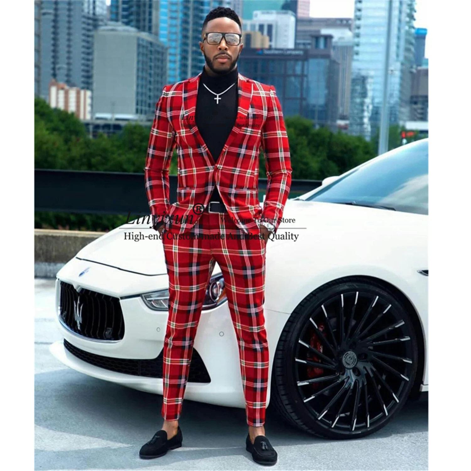 Модные клетчатые красные мужские костюмы, облегающий свадебный смокинг для жениха с лацканами, 2 предмета, блейзер для лучшего мужчины, мужской костюм для выпусквечерние вечера