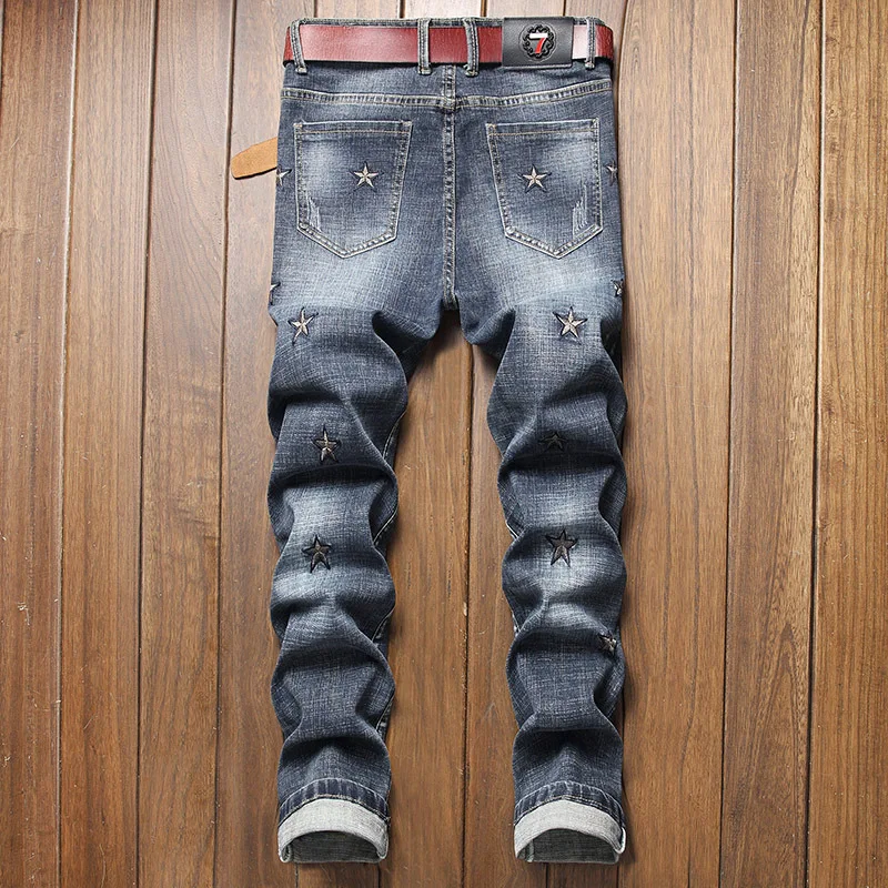 Джинсы джинсовые повседневные хлопковые синие Молодежные пятнистые брюки с обычной вышивкой Звездный дизайн модные крутые джинсы
