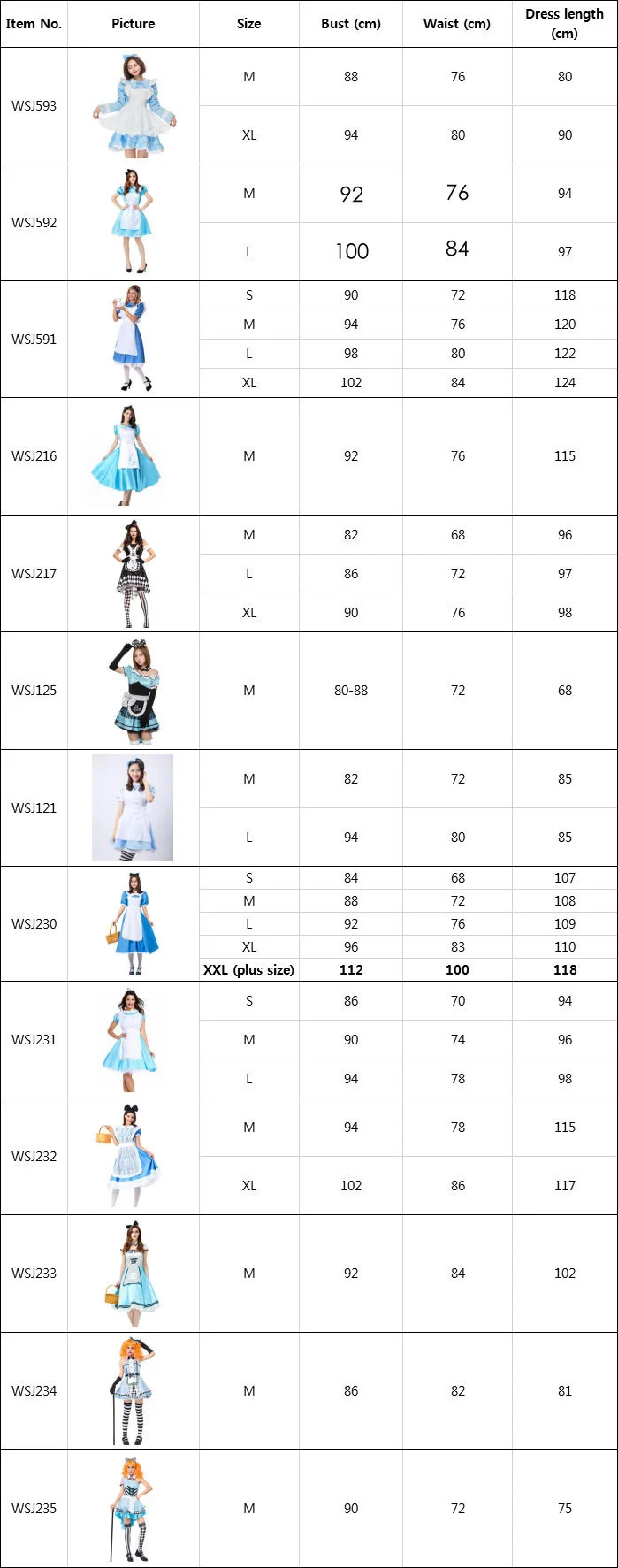 WSJ591: платье + головной убор + фартукWSJ592: платье + фартук + черная повязка на голову + синяя повязка на головуWSJ593: платье + фартук + рукава + повязка на голову + галстук-бабочкаWSJ121: платье + фартук + головной уборWSJ125: платье + перчатки + повязка на голову + шея + галстук-бабочкаWSJ216: платье + фартук + повязка на головуWSJ217: платье + фартук + повязка на голову + перчаткиWSJ230: платье + головной убор + фартукWSJ231: платье + головной убор + фартукWSJ232: платье + головной убор + фартукWSJ233: платье + головной убор + горловинаWSJ234: платье + головной убор + галстук-бабочка + фартук + перчатки + чулкиWSJ235: платье + головной убор + горловина