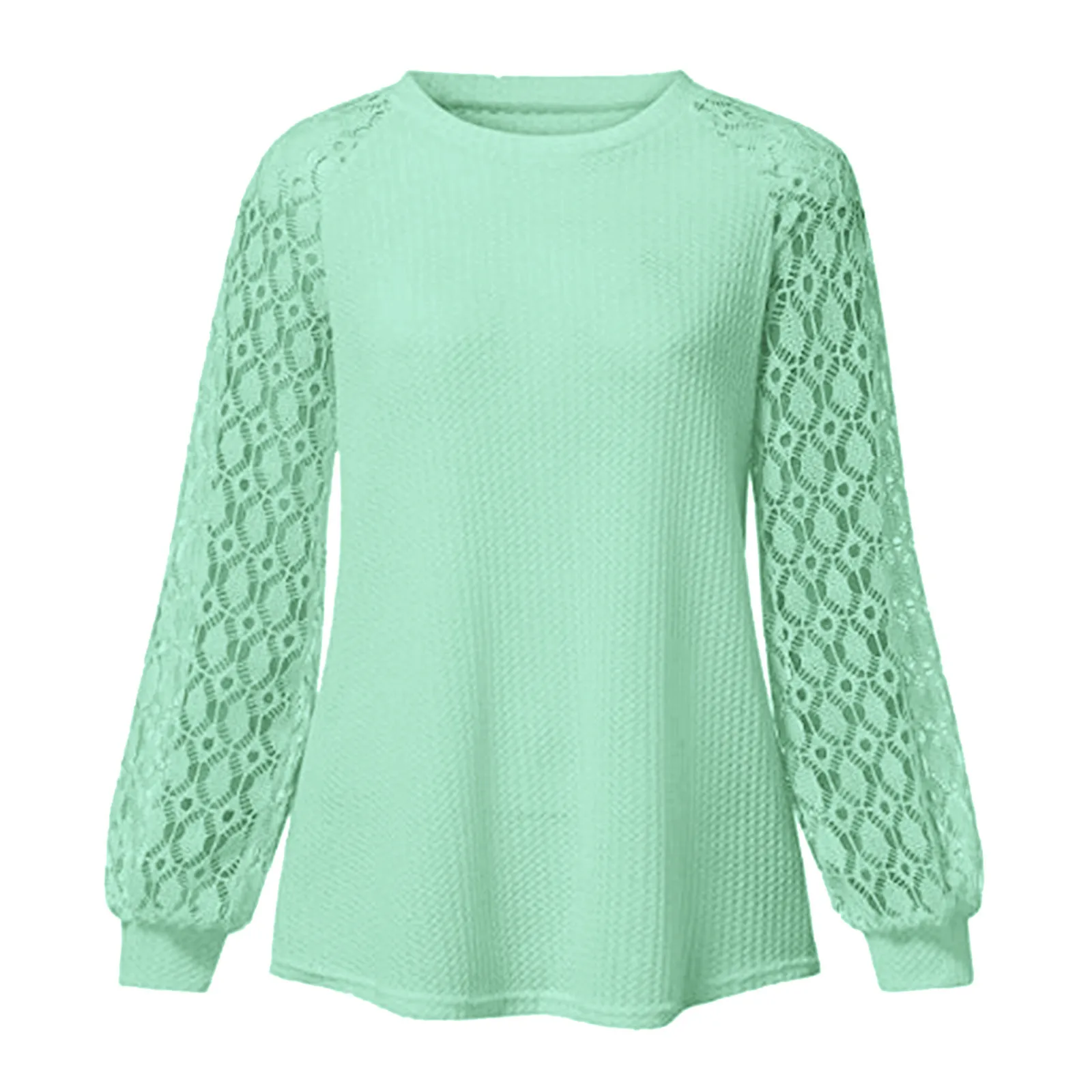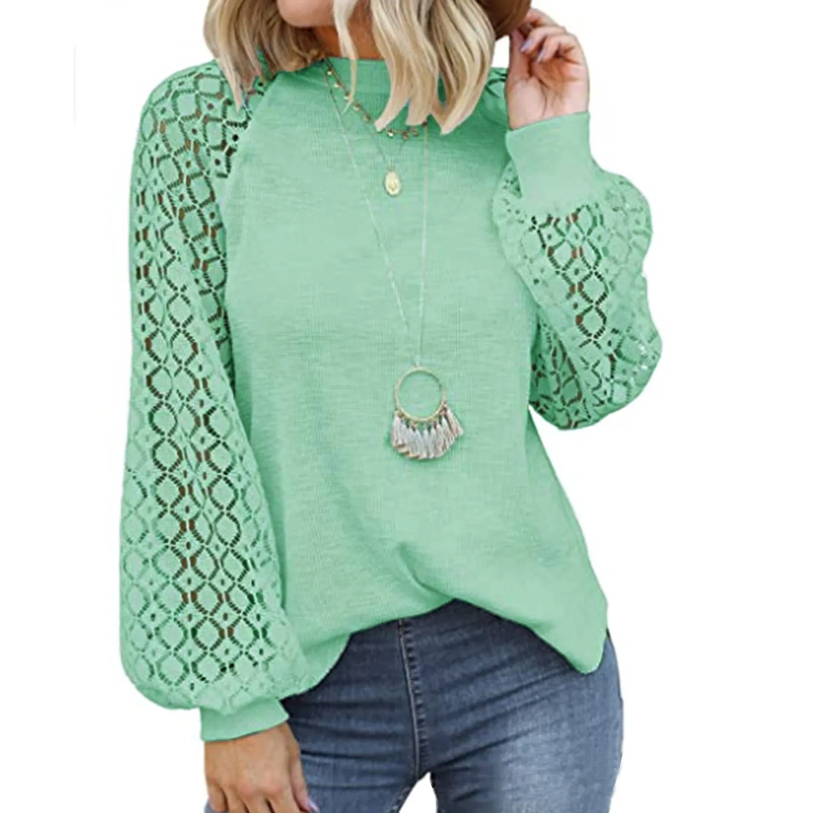 Женская ажурная кружевная блузка, элегантная повседневная трикотажная рубашка с длинным рукавом, винтажный пуловер с круглым вырезом, однотонная уличная одежда на осень