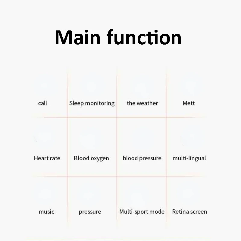 1. Здоровье и здоровье: Измерение кислорода в крови, Мониторинг Артериального Давления, мониторинг сердечного ритма, трекер сна, тренировка дыхания, напоминание о малоподвижности. 2. Идеально подходит для занятий: Шагомер, запись сожженных калорий, режимы тренировки. 3. Технологии: BT вызов, воспроизведение музыки, пульт дистанционного управления камерой, уведомления, цифровая корона, сплит-экран, несколько циферблатов часов, 3D динамический циферблат, поворот запястья, будильник, калькулятор, будильник, секундомер, погода, найдите мой браслет