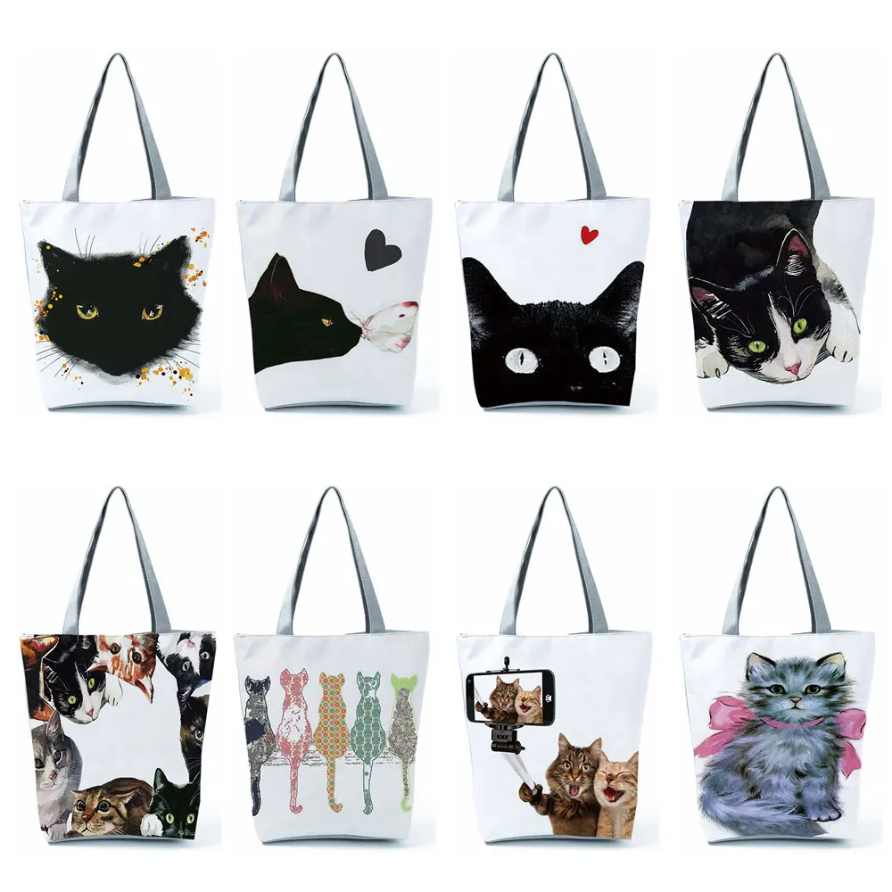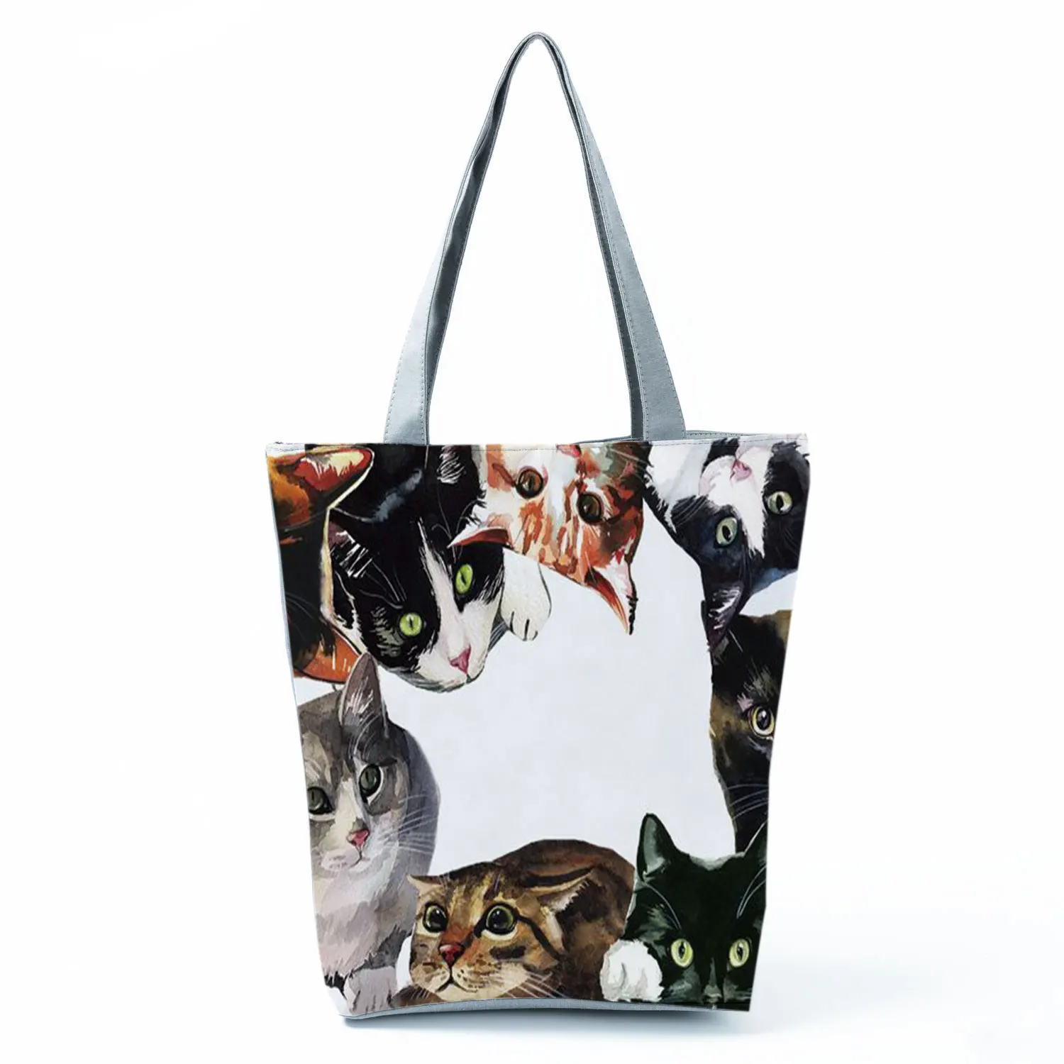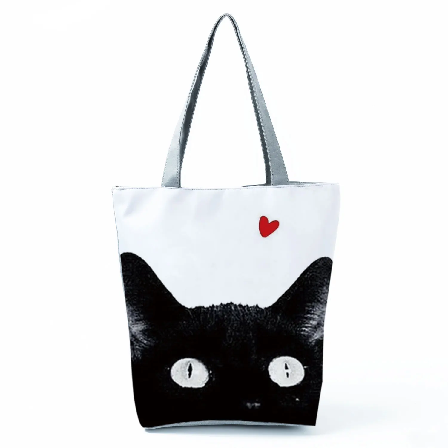 Женские дизайнерские сумки ручной работы с акварельным рисунком черного кота, многоразовые сумки для покупок, школьные сумки для книг