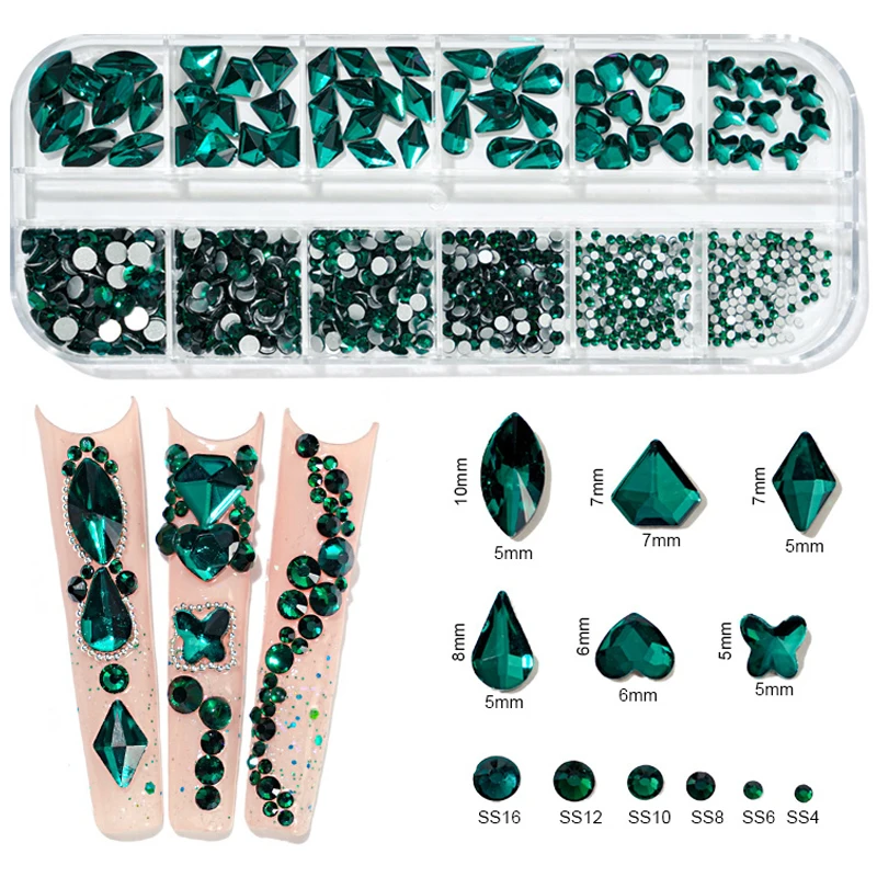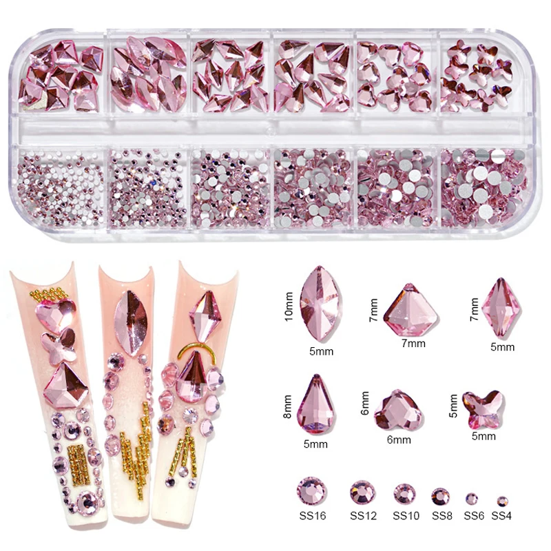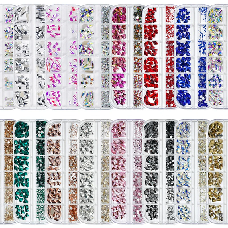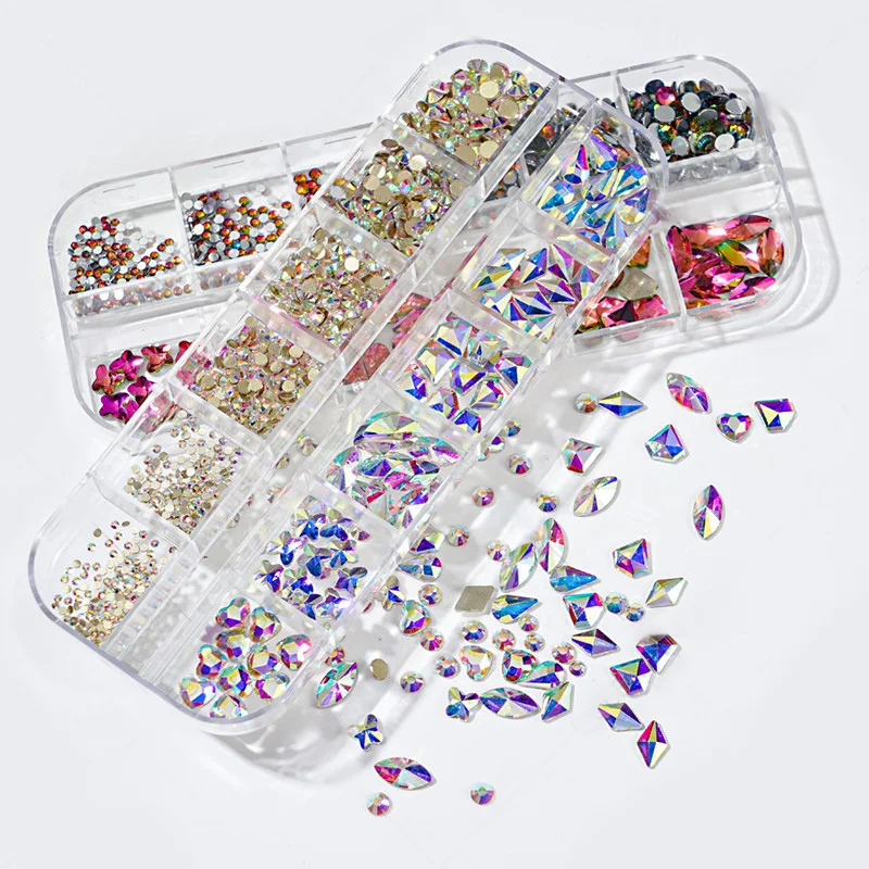 Прозрачные стразы с плоской задней стороной, 12 цветовкоробка, разные размеры, AB, розовый, зеленый цвет, стразы, бриллианты, драгоценные камни, 3D блестки, украшения для дизайна ногтей