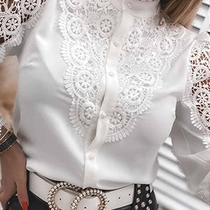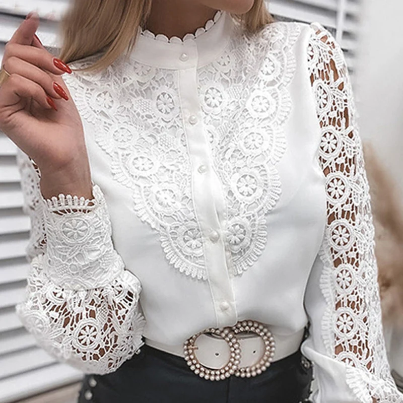 Женская ажурная кружевная блузка, элегантная повседневная винтажная белая рубашка составного кроя с длинным рукавом, осень 2021