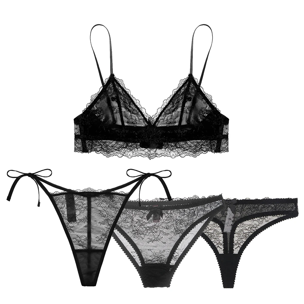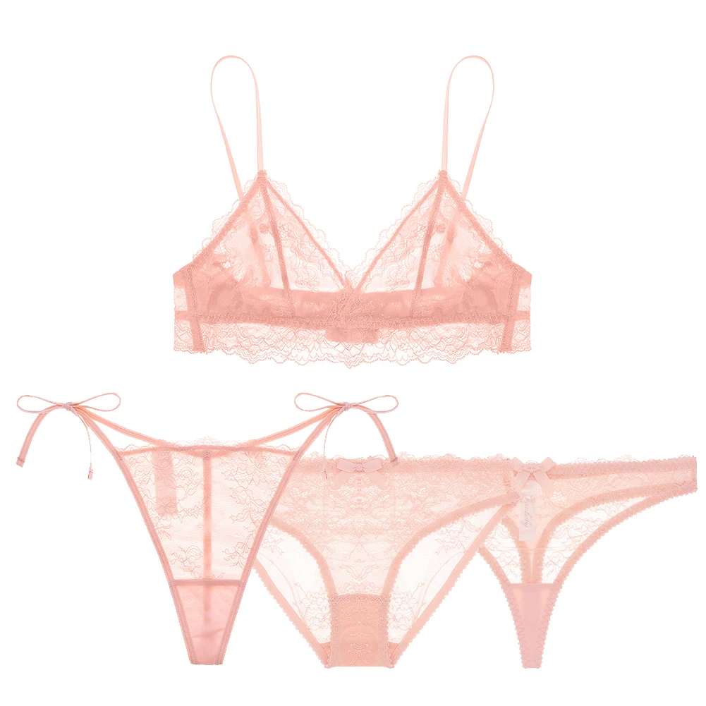 Varsbabyженское ультратонкое кружевное нижнее белье во французском стиле без стальных колец, сексуальный комплект с бюстгальтером-стринги, бюстгальтер с мягкой чашкой + Тонг + трусики, 3 шт.лот