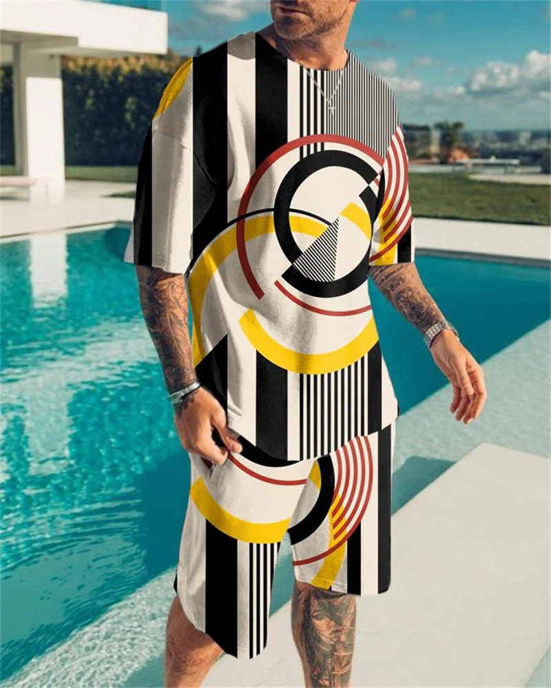 Мужской спортивный костюм с коротким рукавом, однотонный повседневный костюм с 3D-принтом фиолетового цвета и геометрическим узором, лето 2021