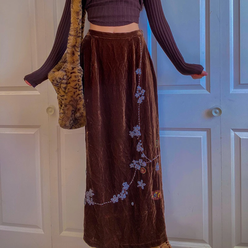 Длинная прямая юбка в стиле ретро, с цветочной вышивкой
