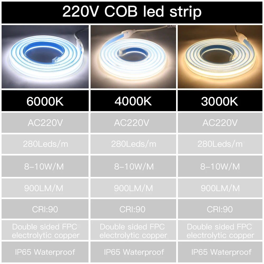 Светодиодная лента COB, 220 В, 15 м, 10 м, 5 м, 280 светодиодов