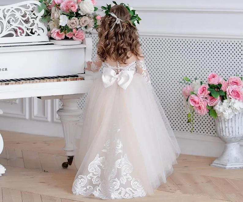 Платье для девочки с цветочным принтом, белое, цвета слоновой кости, с коротким рукавом, с кружевной аппликацией, пышное, для свадьбы, Тюлевое платье для девочки на Первое причастие
