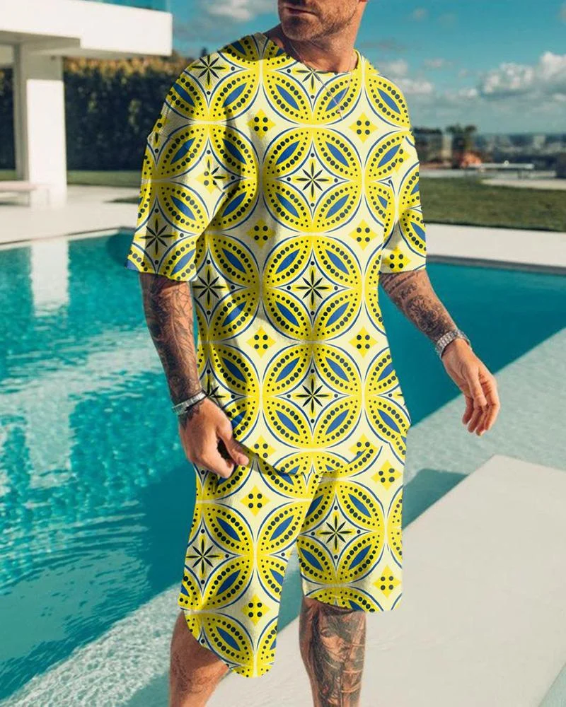 Модный простой мужской свободный костюм в европейском и американском стиле с 3D геометрическим рисунком и коротким рукавом, спортивный повседневный мужской костюм из футболки с круглым вырезом