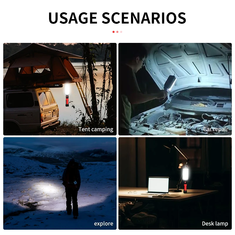 Прочный, с высококачественным производственным материалом. Новая технология COB светодиодный источник освещения, предлагает 700Lm высокой яркости дневного света луч. С мощным магнитом на задней части, вы можете прикрепить его к машине или другой металлической поверхности, чтобы использовать как рабочий светильник, лампа для кемпинга. С крючком сверху, может быть легко использован там, где магнит не может быть поглощен. Подходит для самозащиты, кемпинга, треккинга, ночной езды, ремонта автомобилей и т. д.