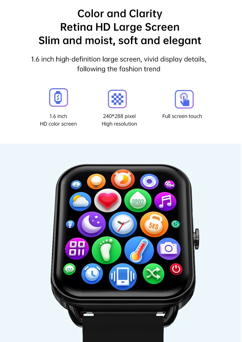 24 мониторинга сердечного ритма1,6 дюймовый HD экранIP67 водонепроницаемый7 дней в режиме ожиданияУльтратонкий и ультратонкийЛегкие часы