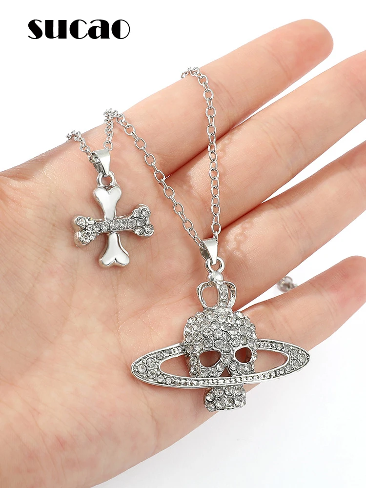 Новое блестящее Ожерелье Стразы с крестом и черепом, Сатурн серебряного цвета, индивидуальность для вечеринки, сотни подходящих пар, ожерелье для женщин, подарок