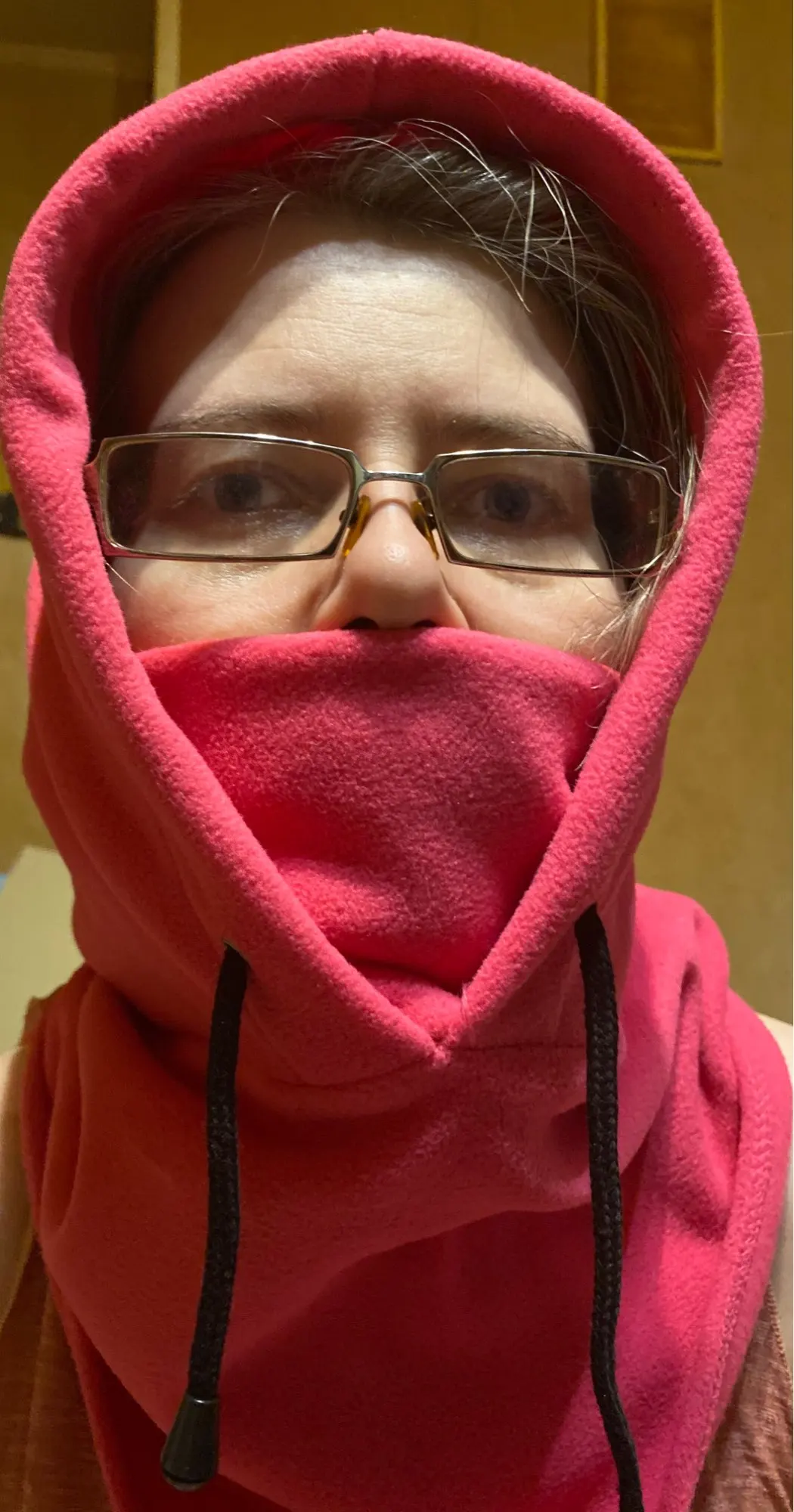 Очень тёплый капюшон с тёплой маской не плотно прилегающей к лицу - это важно, чтобы свежий воздух все же попал. Но не очень удобно сделан низ. Посмотри как будет с тёплой кофтой, когда будут воротники - может быть будет намного удобнее чем показалось при примерке на майку. Как раз на этой недели обещают похолодание: будет возможность примерить. К тому же у меня одна руа плохо работает после операций: проблема надеть снять шапку, в капюшон я могу снять/ надеть запросто. Доставка 3 недели в общей посылке